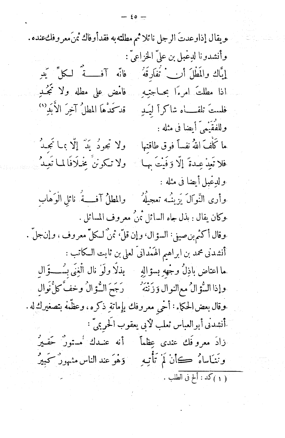 ويقال: إذا وعدت الرجل نائلاً ثم مطلته به، فقد أوفاك ثمن معروفك عنده. وأنشدونا لدعبل بن علي الخزاعي:
