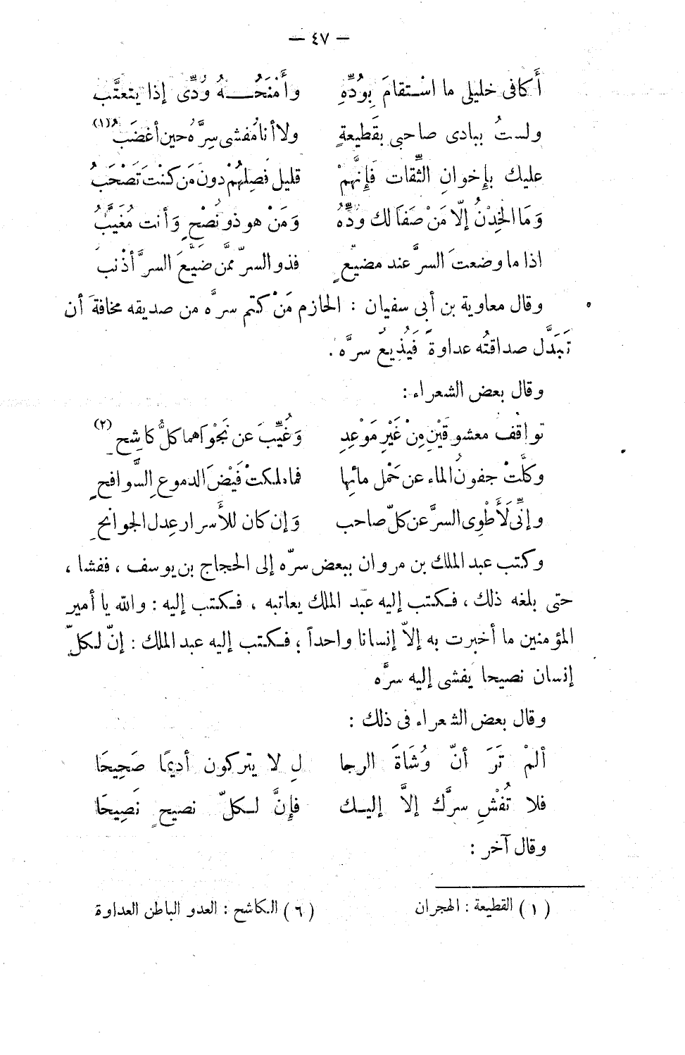 وقال معاوية بن أبي سفيان: الحازم من كتم سره من صديقه مخافة أن تبدَّل صداقته عداوة، فيذيع سره. وقال بعض الشعراء: