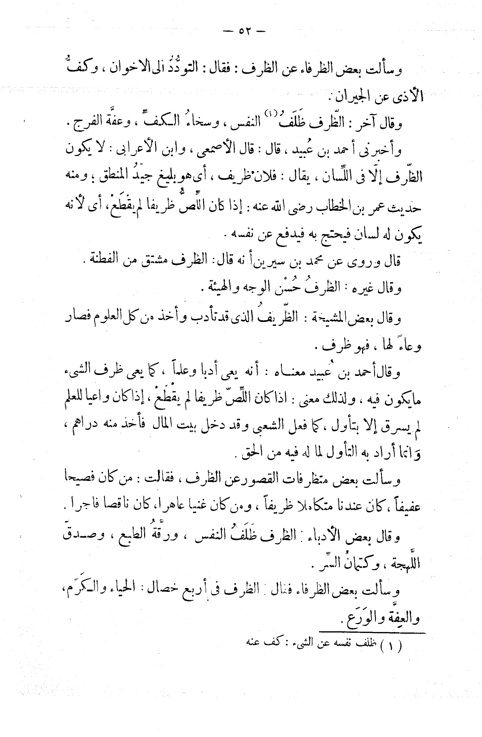 وقال بعض الأدباء: الظرف ظلف النفس، ورقة الطبع، وصدق اللهجة، وكتمان السر. وسألت بعض الظرفاء فقال: الظرف في أربع خصال: الحياء، والكرم، والعفة، والورع؛