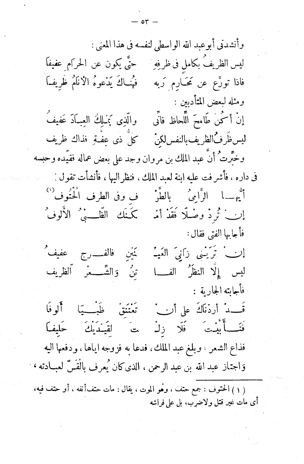 وخبرت أن عبد الملك بن مروان وجد على بعض عماله فقيده وحبسه في داره، فأشرفت عليه ابنة لعبد الملك، فنظر إليها، فأنشأت تقول: