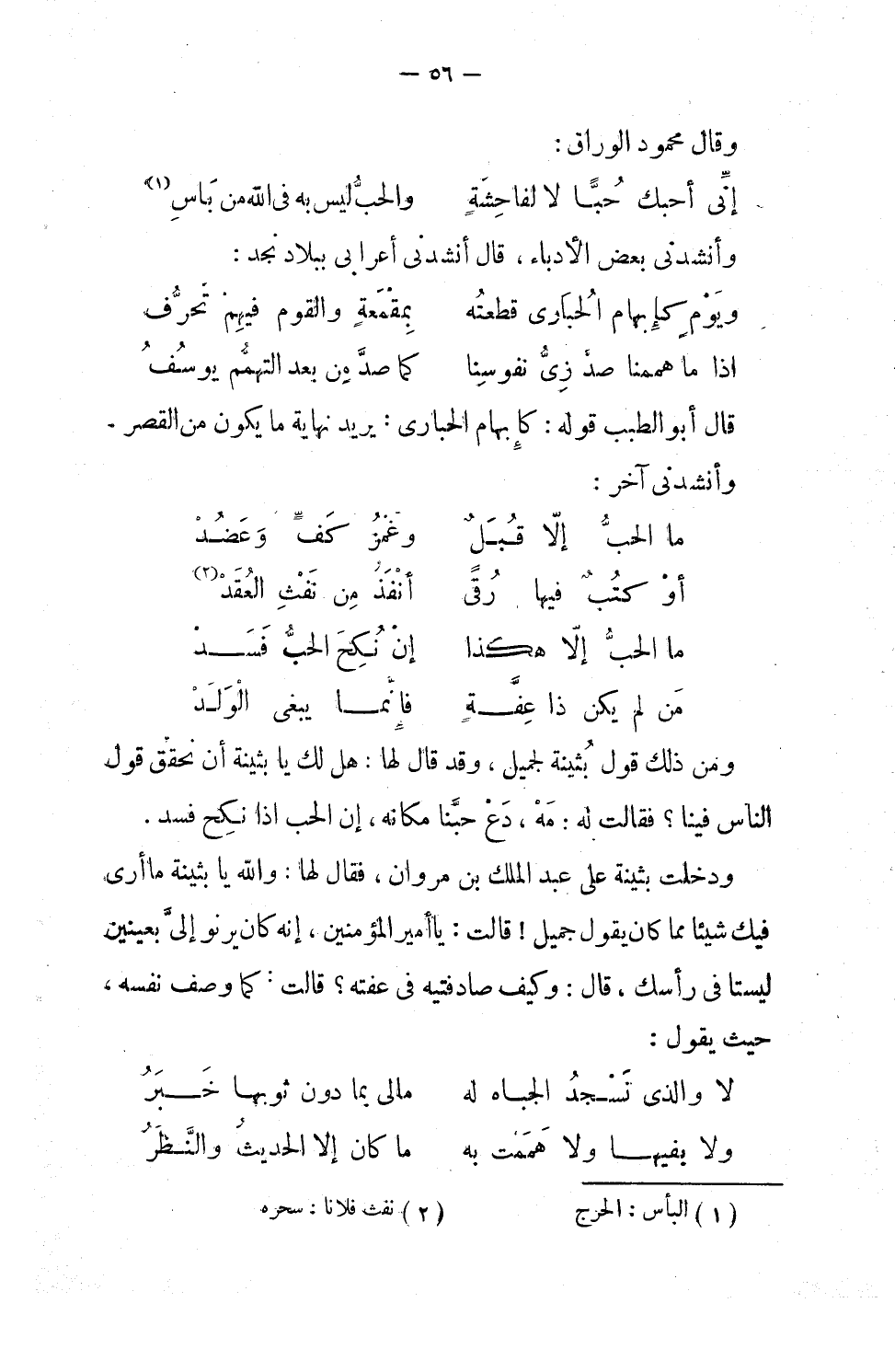 ومن ذلك قول بثينة لجميل، وقد قال لها: هل لك يا بثينة أن نحقق قول الناس فينا؟ فقالت له: مه، دع حبنا مكانه، إن الحب إذا نكح فسد.