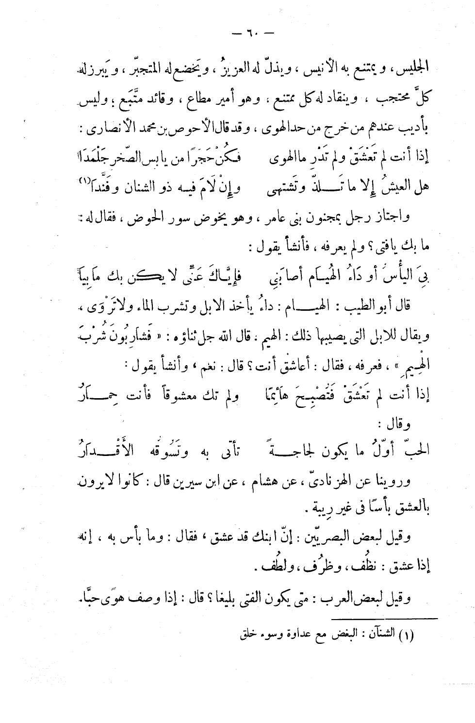 وروينا عن الهزنادي عن هشام عن ابن سيرين قال: كانوا لا يرون بالعشق بأساً في غير ريبة. وقيل لبعض البصريين: إن ابنك قد عشق، فقال: وما بأس به، إنه إذا عشق نظف وظرف ولطف. وقيل لبعض العرب: متى يكون الفتى بليغاً؟ قال: إذا وصف هوىً حياً.