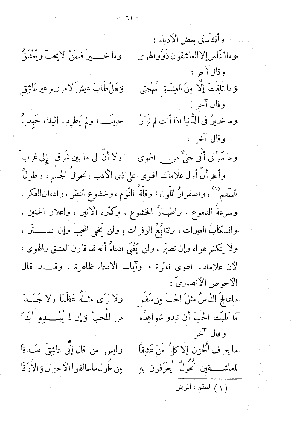واعلم أن أول علامات الهوى على ذي الأدب نحول الجسم، وطول السقم، واصفرار اللون، وقلة النوم، وخشوع النظر، وإدمان الفكر، وسرعة الدموع، وإظهار الخشوع، وكثرة الأنين، وإعلان الحنين، وانسكاب العبرات، وتتابع الزفرات، ولن يخفى المحب، وإن تستر، ولا ينكتم هواه، وإن تصبر، ولن يغبى ادعاء أنه قد قارن العشق والهوى، لأن علامات الهوى نائرة، وآيات الادعاء ظاهرة. وقد قال الأحوص الأنصاري: