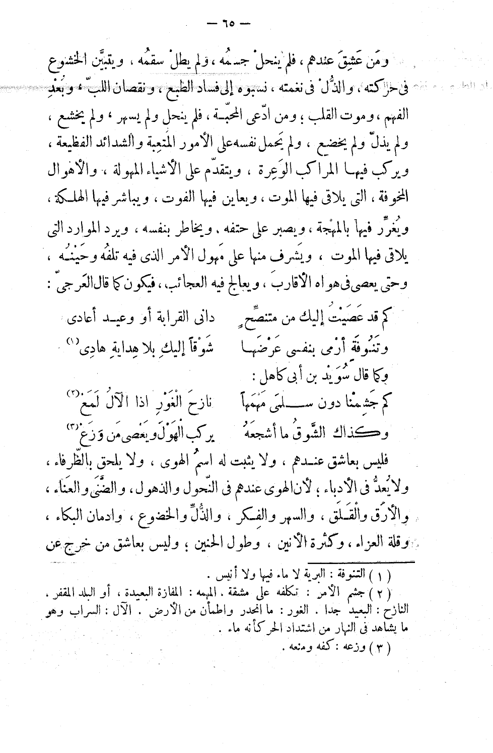 فليس بعاشق عندهم، ولا يثبت له اسم الهوى، ولا يلحق بالظرفاء، ولا يعد في الأدباء، لأن الهوى عندهم في النحول، والذهول، والضنى، والعناء، والأرق، والقلق، والسهر، والفكر، والذل والخضوع والانكسار والخشوع وإدمان البكاء وقلة العزاء، وكثرة الأنين وطول الحنين، وليس بعاشق من خرج عن