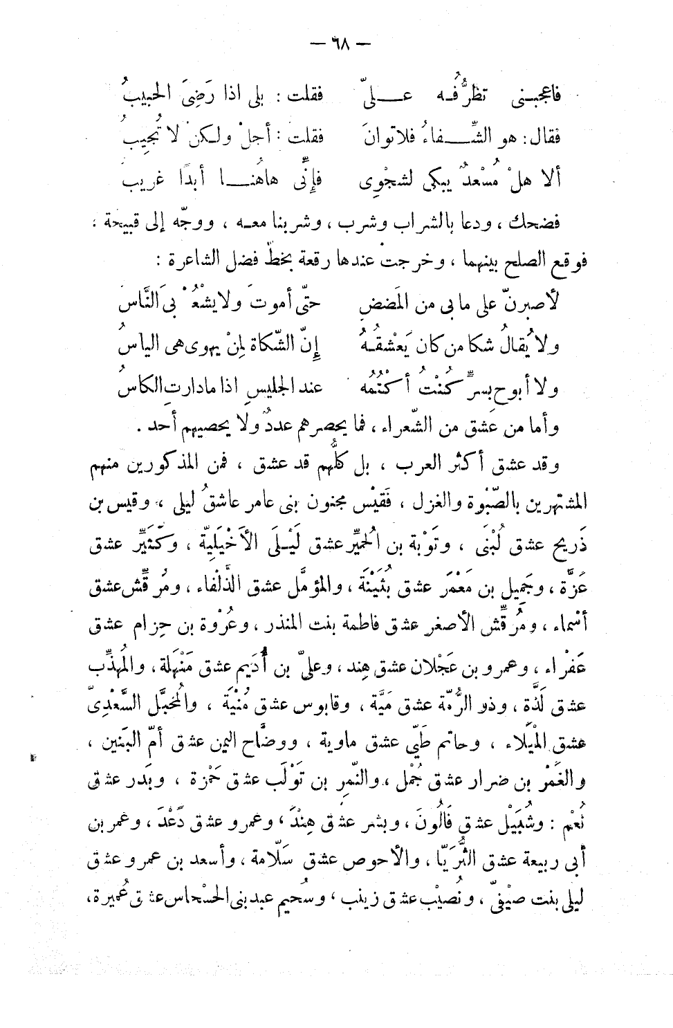 وأما من عشق من الشعراء فما يحصرهم عدد، ولا يحصيهم أحد. وقد عشق أكثر العرب، بل كلهم قد عشق، فمن المذكورين منهم المشتهرين بالصبوة والغزل: فقيس مجنون بني عامر عشق ليلى، وقيس بن ذريح عشق لبنى، وتوبة بن الحمير عشق ليلى الأخيلية، وكثير عشق عزة، وجميل بن معمر عشق بثينة، والمؤمل عشق الذَّلفاء، ومرقش عشق أسماء، ومرقش الأصغر عشق فاطمة بنت المنذر، وعروة بن حزام عشق عفراء، وعمرو بن عجلان عشق هند، وعلي بن أديم عشق منهلة، والمهذب عشق لذة، وذو الرمة عشق مية، وقابوس عشق منية، والمخبل السعدي عشق الميلاء، وحاتم طيء عشق ماوية، ووضاح اليمن عشق أم البنين، والغمر بن ضرار عشق جُمل، والنمر بن تولب عشق حمزة، وبدر عشق نعم، وشبيل عشق فالون، وبشر عشق هند، وعمرو عشق دعد، وعمر بن أبي ربيعة عشق الثريا، والأحوص عشق سلامة، وأسعد بن عمرو عشق ليلى بنت صيفي، ونصيب عشق زينب، وسحيم عبد بني الحسحاس عشق عميرة،