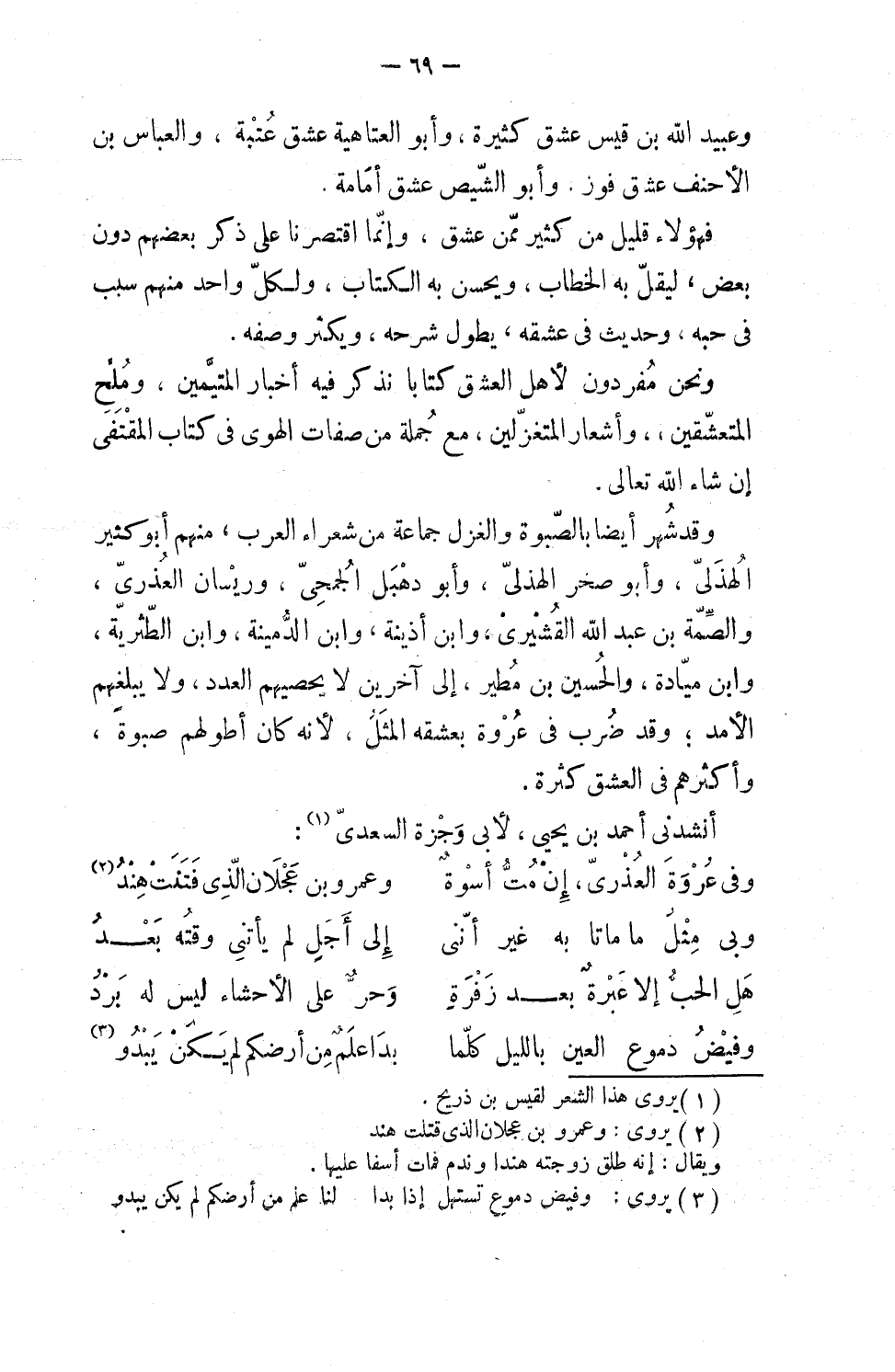 وعبيد الله بن قيس عشق كثيرة، وأبو العتاهية عشق عتبة، والعباس بن الأحنف عشق فوز، وأبو الشيص عشق أمامة. فهؤلاء قليل من كثير ممن عشق، وإنما اقتصرنا على ذكر بعضهم دون بعض ليقل به الخطاب ويحسن به الكتاب، ولكل واحد منهم سبب في حبه، وحديث في عشقه يطول شرحه، ويكثر وصفه، ونحن مفردون لأهل العشق كتاباً نذكر فيه أخبار المتيمين، وملح المتعشقين، وأشعار المتغزلين مع جملة من صفات الهوى في كتاب المقتفى، إن شاء الله تعالى.
