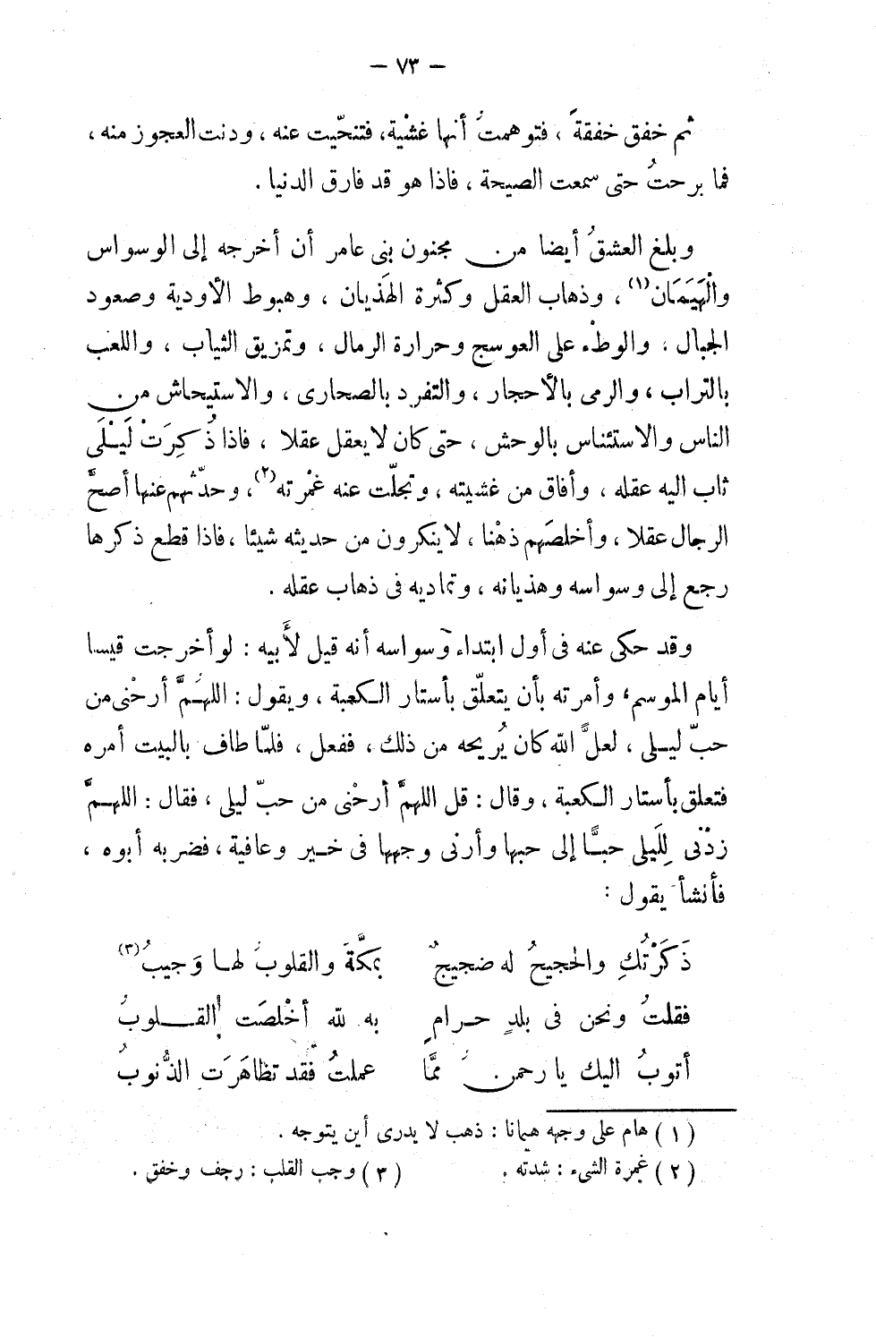 وبلغ العشق أيضاً من مجنون بني عامر أن أخرجه إلى الوسواس والهيمان وذهاب العقل، وكثرة الهذيان، وهبوط الأودية، وصعود الجبال، والوطء على العوسج وحرارة الرمال، وتمزيق الثياب واللعب بالتراب، والرمي بالأحجار، والتفرد بالصحاري والاستيحاش من الناس، والاستئناس بالوحش حتى كان لا يعقل عقلاً، فإذا ذكرت ليلة ثاب إليه عقله، وأفاق من غشيته وتجلت عنه غمرته، وحدثهم عنها أصحَّ الرجال عقلاً، وأخلصهم ذهناً، لا ينكرون من حديثه شيئاً، فإذا قطع ذكرها رجع إلى وسواسه وهذيانه وتماديه في ذهاب عقله.