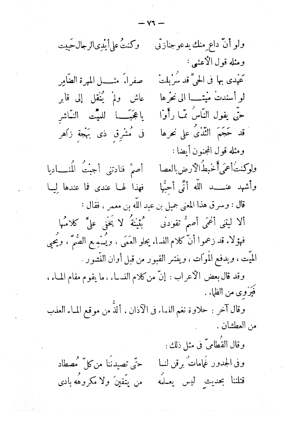 فهؤلاء قد زعموا أن كلام النساء ينجلو العمى، ويسمع الصم ويحيي الميت، ويدفع الموات وينشر القبور من قبل أوان النشور، وقد قال بعض الأعراب: إن من كلام النساء ما يقوم مقام الماء فيروي من الظماء. وقال آخر: حلاوة نغم النساء في الآذان ألذ من موقع الماء العذب من العطشان. وقال القطامي في مثل ذلك:
