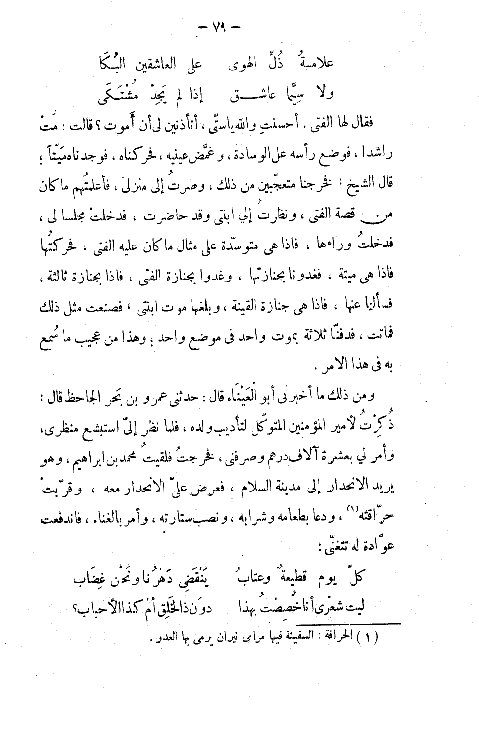فقال لها الفتى: أحسنت، والله، يا ستي، أتأذنين لي أن أموت؟ قالت: مت راشداً؛ فوضع رأسه على الوسادة، وغمض عينيه، فحركناه فوجدناه ميتاً. قال الشيخ: فخرجنا متعجبين من ذلك، وصرت إلى منزلي، فأعلمتهم ما كان من قصة الفتى، ونظرت إلى ابنتي، وقد حاضرت، فدخلت مجلساً لي، فدخلت وراءها، فإذا هي متوسدة على مثال ما كان عليه الفتى، فحركتها فإذا هي ميتة، فغدونا بجنازتها، وغدوا بجنازة الفتى، فإذا بجنازة ثالثة، فسألنا عنها، فإذا هي جنازة القينة، وبلغها موت ابنتي، فصنعت مثل ذلك، فماتت. فدفنا ثلاثة بموت واحد في موضع واحد. وهذا من عجيب ما سمع به في هذا الأمر.