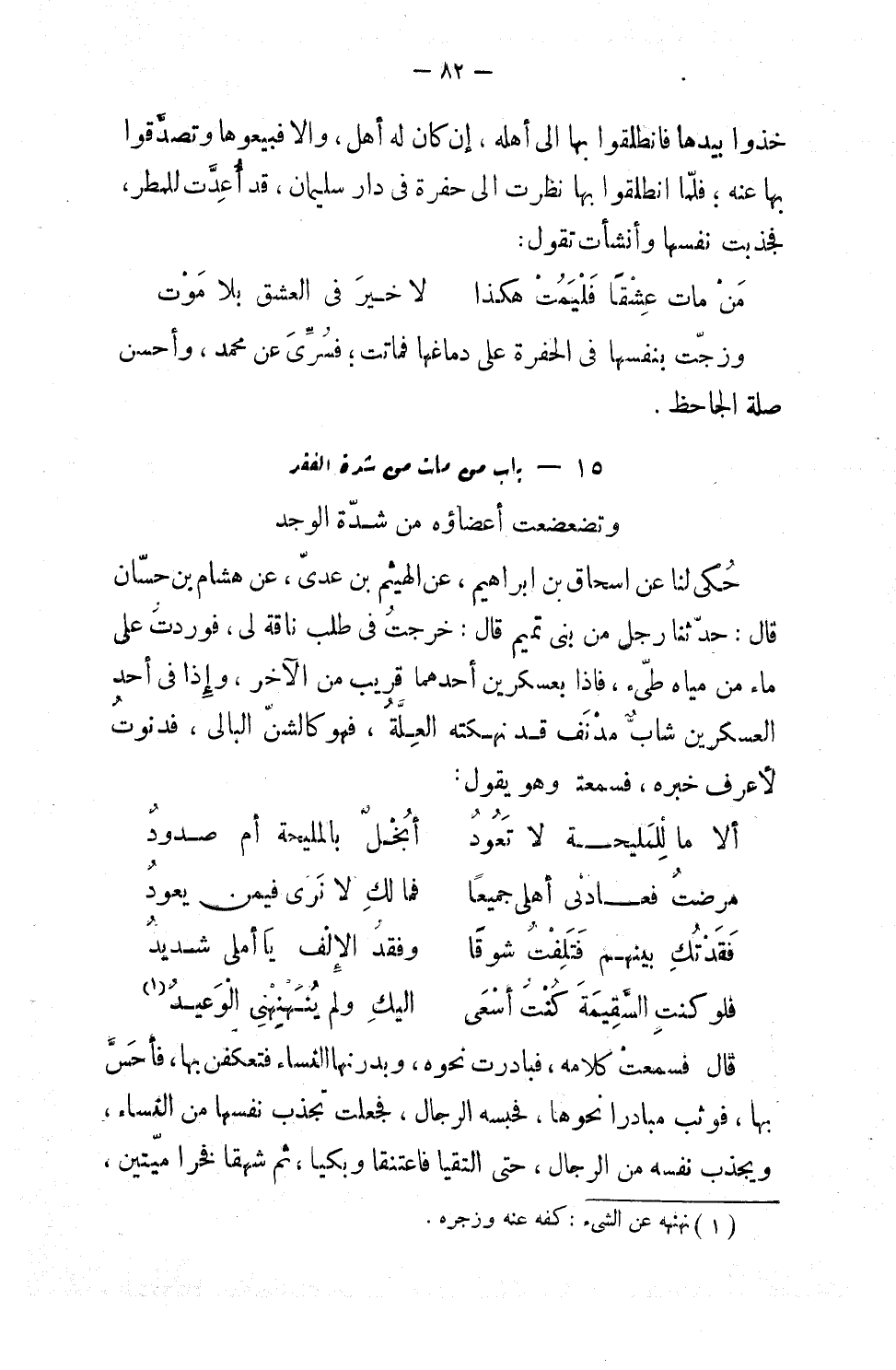 وزجّت بنفسها في الحُفرة على دماغها، فماتت. فسُرّيُ عن محمد، وأحسنَ صِلةً الجاحظ.