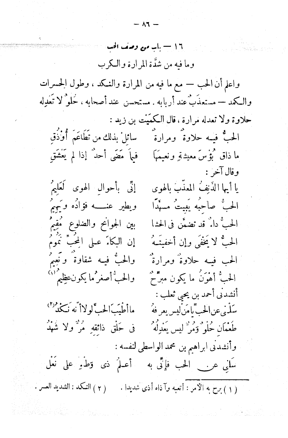 واعلم أن الحبّ، مع ما فيه من المرارة والنكد، وطول الحسرات والكمد، ومرٌّ لا تعدله مرارة، قال الكميت بن زيد: