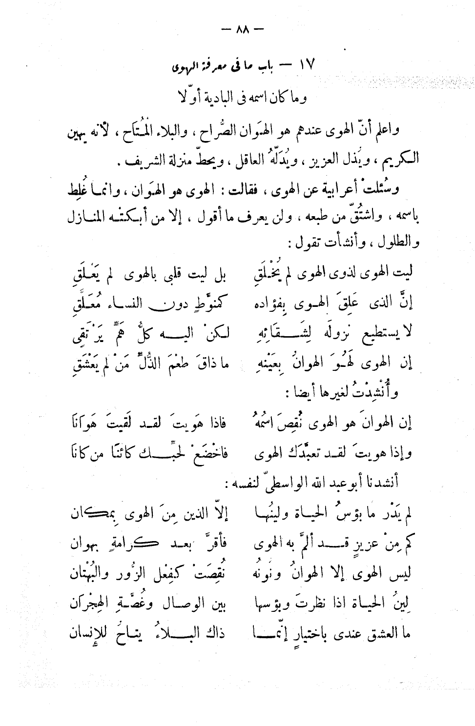 واعلم أن الهوى عندهم هو الهوان الصُّراح، والبلاء المتاح، لأنه يُهين الكريم، ويُذلُّ العزيز، ويدلّه العاقل، ويحطّ منزلة الشريف. وسُئلت أعرابية عن الهوى، فقالت: الهوى هو الهوان وإنما غُلِظ باسمه، واشتُقّ من طبعه، ولن يعرف ما أقول إلا من أبكته المنازل والطلول؛ وأنشأت تقول: