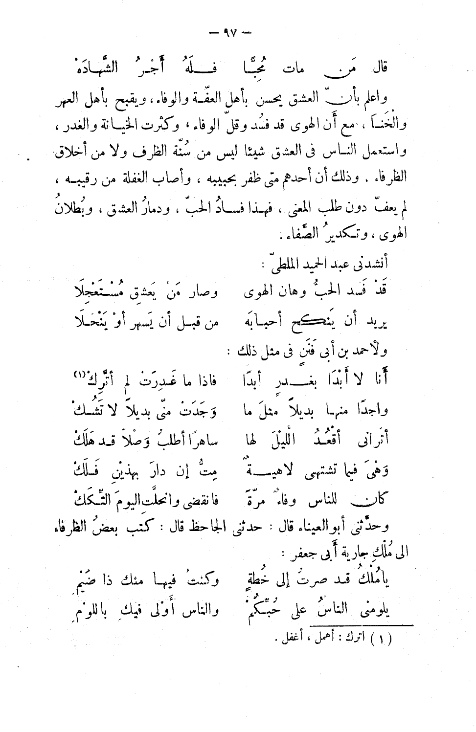 واعلم بأن العشق يَحسُنُ بأهل العفّة والوفاء، ويقبحُ بأهل العهر والخَنى مع أن الهوى قد فسد وقلّ الوفاء وكثُرت الخيانة والغدر، واستعمل الناس في العشق شيئاً ليس من سُنّة الظرف، ولا من أخلاق الظرفاء، وذلك أن أحدهم متى ظفر بحبيبه، وأصاب الغفلة من رقيبه، لم يَعفّ دون طلب الصفاء. أنشدني عبد الحميد المَلطي: