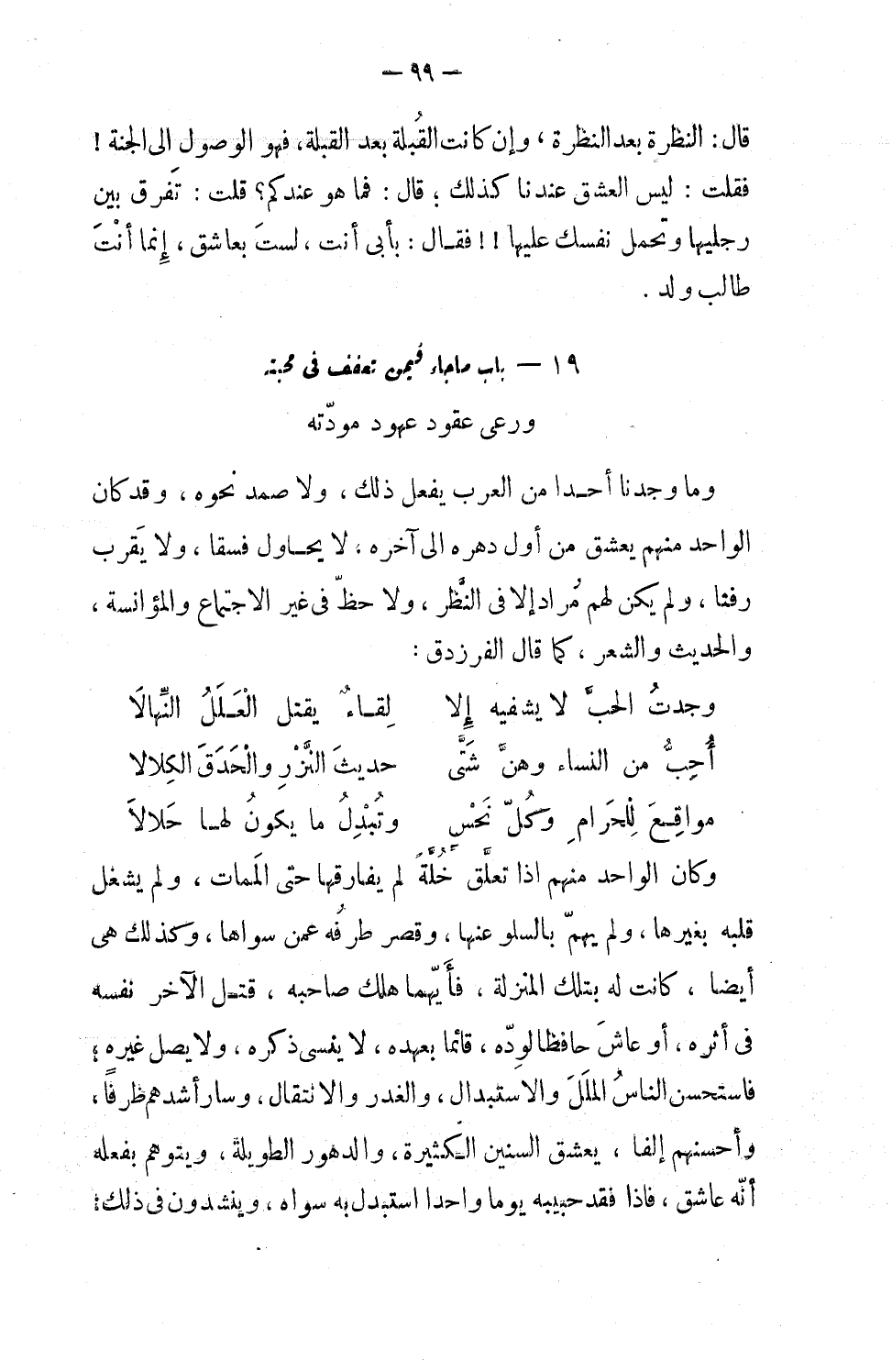وما وجدنا أحداً من العرب يفعل ذلك، ولا صمد نحوه، وقد كان الواحد منهم يعشق من أول دهره إلى آخره لا يُحاول فِسقاً، ولا يقرب رفثاً، ولم يكن لهم مراد إلا في النظر، ولا حظّ في غير الاجتماع والمؤانسة، والحديث والشعر، كما قال الفرزدق: