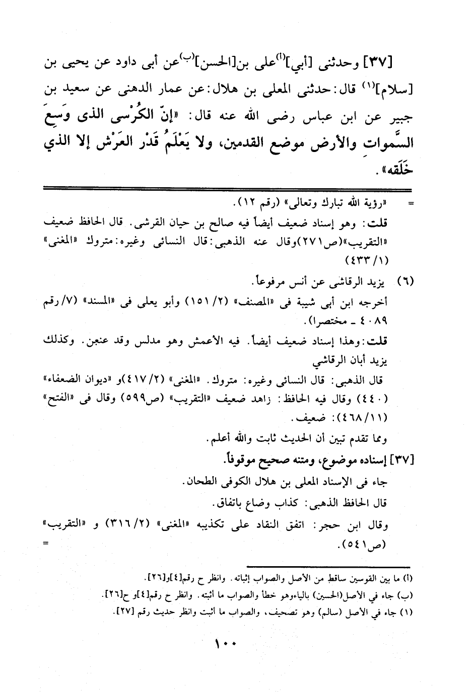 37 - وَحَدَّثَنِي أَبِي عَلِيُّ بْنُ اَلْحَسَنِ عَنْ أَبِي دَاوُدَ، عَنْ يَحْيَى بْنِ سَلَامٍ قَالَ: حَدَّثَنِي اَلْمُعَلَّى بْنُ هِلَالٍ عَنْ عَمَّارٍ اَلدُّهْنِيِّ عَنْ سَعِيدِ بْنِ جُبَيْرٍ، عَنْ اِبْنِ عَبَّاسٍ رَضِيَ اَللَّهُ عَنْهُ قَالَ: إِنَّ اَلْكُرْسِيَّ اَلَّذِي وَسِعَ اَلسَّمَاوَاتِ وَالْأَرْضَ مَوْضِعُ اَلْقَدَمَيْنِ، وَلَا يَعْلَمُ قَدْرَ اَلْعَرْشِ إِلَّا اَلَّذِي خَلَقَهُ
