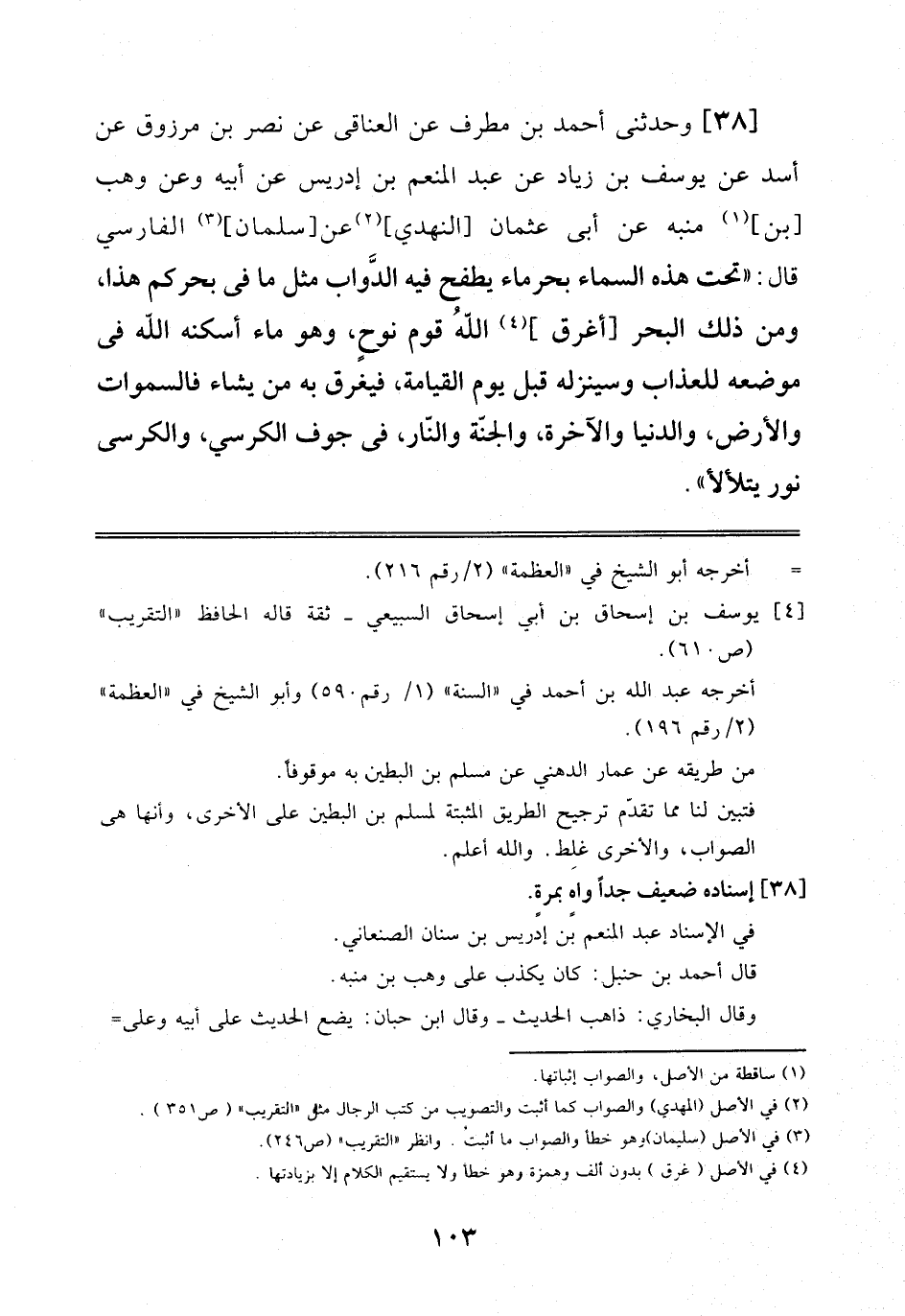 38 - وَحَدَّثَنِي أَحْمَدُ بْنُ مُطَرِّفٍ، عَنْ اَلْعِنَاقِيّ، عَنْ نَصْرِ بْنِ مَرْزُوقٍ، عَنْ أَسَدٍ، عَنْ يُوسُفَ بْنِ زِيَادٍ، عَنْ عبد المنعم بْنِ إِدْرِيسَ، عَنْ أَبِيهِ، وَعَنْ وَهْبِ بْنِ مُنَبِّهٍ، عَنْ أَبِي عُثْمَانَ النَّهْدِيِّ، عَنْ سَلْمَانَ اَلْفَارِسِيِّ قَالَ: "تَحْتَ هَذِهِ اَلسَّمَاءِ بَحْرُ مَاءٍ يَطْفَحُ فِيهِ اَلدَّوَابُّ مِثْلُ مَا فِي بَحْرِكُمْ هَذَا، وَمِنْ ذَلِكَ اَلْبَحْرِ أَغْرَقَ اَللَّهُ قَوْمَ نُوحٍ، وَهُوَ مَا أَسْكَنَهُ اَللَّهُ فِي مَوْضِعِهِ لِلْعَذَابِ وَسَيُنْزِلُهُ قَبْلَ يَوْمِ اَلْقِيَامَةِ، فَيُغْرِقُ بِهِ مَنْ يَشَاءُ فَالسَّمَاوَاتُ وَالْأَرْضُ، وَالدُّنْيَا وَالْآخِرَةُ، وَالْجَنَّةُ وَالنَّارُ فِي جَوْفِ اَلْكُرْسِيِّ، وَالْكُرْسِيُّ نُورٌ يَتَلَأْلَأُ".