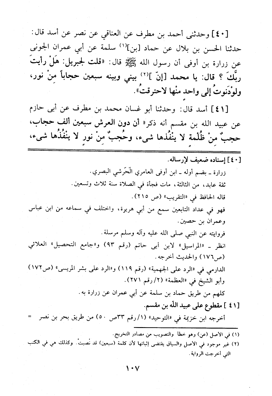 40 - وَحَدَّثَنِي أَحْمَدُ بْنُ مُطَرِّفٍ اَلْعِنَاقِيُّ عَنْ نَصْرٍ، عَنْ أَسَدٍ قَالَ: حَدَّثَنَا اَلْحَسَنُ بْنُ بِلَالٍ، عَنْ حَمَّادِ بْنِ سَلَمَةَ، عَنْ أَبِي عِمْرَانَ الْجَوْنِيِّ، عَنْ زُرَارَةَ بْنِ أَوْفَى أَنَّ رَسُولَ اَللَّهِ صَلَّى اَللَّهُ عَلَيْهِ وَسَلَّمَ قَالَ: قُلْتُ لِجِبْرِيلَ هَلْ رَأَيْتَ رَبَّكَ? قَالَ: يَا مُحَمَّدُ إِنَّ بَيْنِي وَبَيْنَهُ سَبْعِينَ حِجَابًا مِنْ نُورٍ وَلَوْ دَنَوْتُ إِلَى وَاحِدٍ مِنْهَا لَاحْتَرَقْتُ