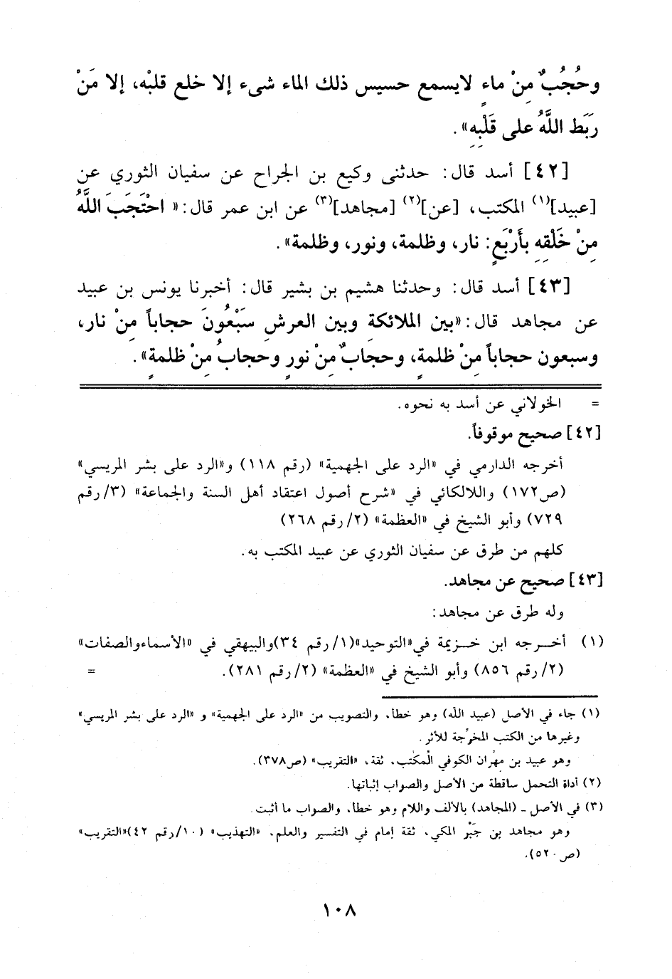43 - أَسَدٌ قَالَ: وَحَدَّثَنَا هُشَيْمُ بْنُ بَشِيرٍ قَالَ: أَخْبَرَنَا يُونُسُ بْنُ عُبَيْدٍ عَنْ مُجَاهِدٍ قَالَ: "بَيْنَ اَلْمَلَائِكَةِ وَبَيْنَ اَلْعَرْشِ سَبْعُونَ حِجَابًا مِنْ نَارٍ، وَسَبْعُونَ حِجَابًا مِنْ ظُلْمَةٍ، وَحِجَابٌ مِنْ نُورٍ، وَحِجَابٌ مِنْ ظُلْمَةِ".