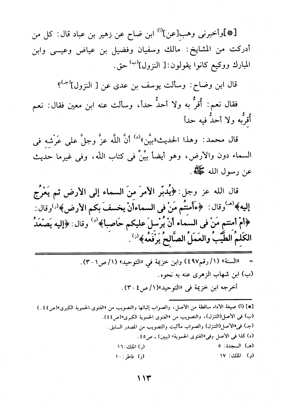 * - وَأَخْبَرَنِي وَهْبٌ عَنْ اِبْنِ وَضَّاحٍ، عَنْ زُهَيْرِ بْنِ عُبَادَةَ قَالَ: كُلُّ مَنْ أَدْرَكْتُ مِنْ اَلْمَشَايِخِ: مَالِكٍ وَسُفْيَانَ وَفُضَيْلِ بْنِ عِيَاضٍ وَعِيسَى وَابْنِ اَلْمُبَارَكِ وَوَكِيعٍ كَانُوا يَقُولُونَ: اَلنُّزُولُ حَقٌّ.