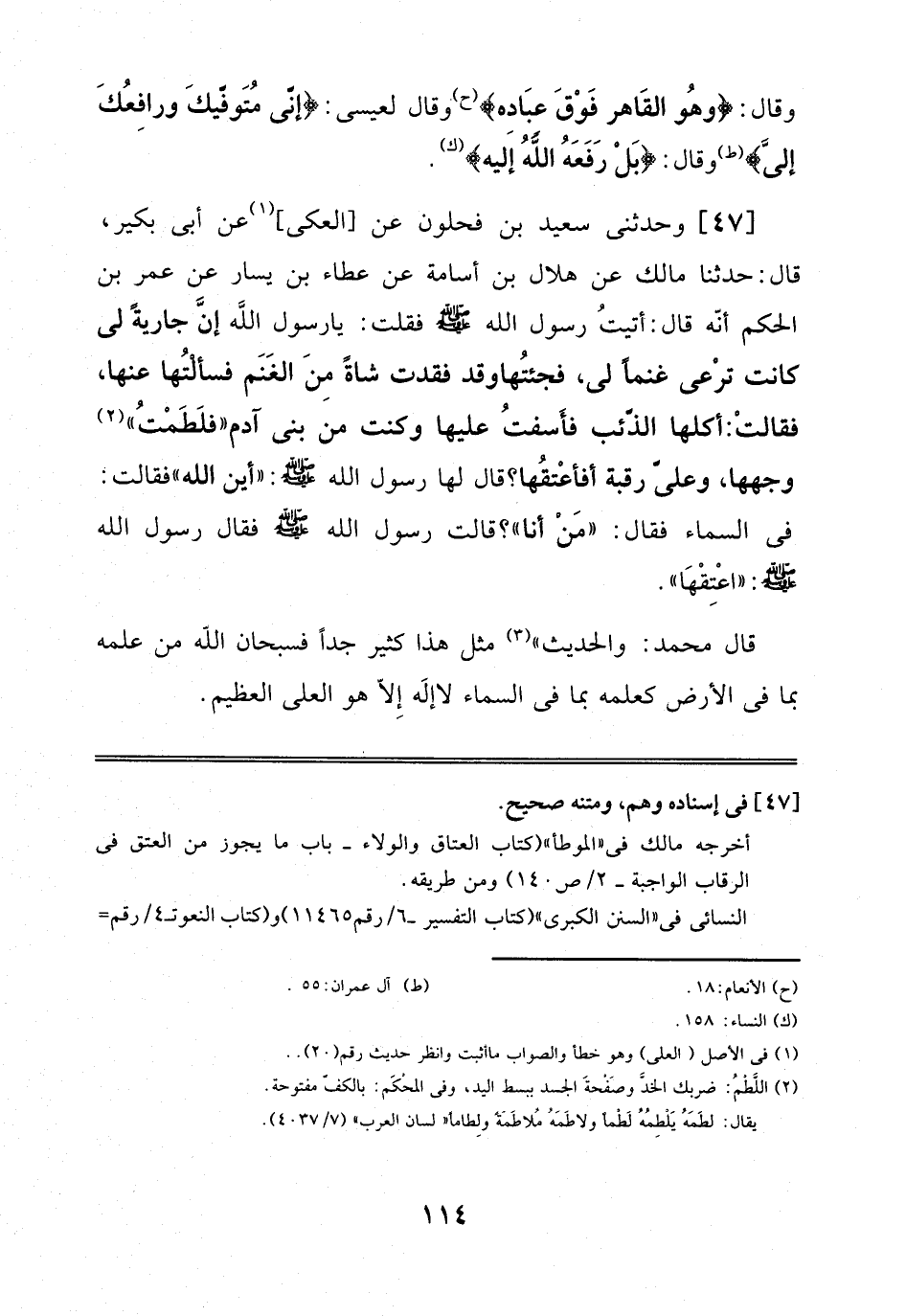 47 - وَحَدَّثَنِي سَعِيدُ بْنُ فَحْلُونَ عَنْ العَكِّيِّ، عَنْ أَبِي بُكَيْرٍ قَالَ: حَدَّثَنَا مَالِكٌ، عَنْ هِلَالِ بْنِ أُسَامَةَ، عَنْ عَطَاءِ بْنِ يَسَارٍ، عَنْ عُمَرَ بْنِ اَلْحَكَمِ أَنَّهُ قَالَ أَتَيْتُ رَسُولَ اَللَّهِ صَلَّى اَللَّهُ عَلَيْهِ وَسَلَّمَ فَقُلْتُ: يَا رَسُولَ اَللَّهِ إِنَّ جَارِيَةً لِي كَانَتْ تَرْعَى غَنَمًا لِي فَجِئْتُهَا وَقَدْ فُقِدَتْ شَاةٌ مِنْ اَلْغَنَمِ فَسَأَلْتُهَا عَنْهَا فَقَالَتْ: أَكَلَهَا اَلذِّئْبُ فَأَسِفْتُ عَلَيْهَا وَكُنْتُ مِنْ بَنِي آدَمَ فَلَطَمْتُ وَجْهَهَا، وَعَلَيَّ رَقَبَةٌ أَفَأُعْتِقُهَا? قَالَ لَهَا رَسُولُ اَللَّهِ صَلَّى اَللَّهُ عَلَيْهِ وَسَلَّمَ: أَيْنَ اَللَّهُ? فَقَالَتْ: فِي اَلسَّمَاءِ فَقَالَ: مَنْ أَنَا? قَالَتْ: رَسُولُ اَللَّهِ صَلَّى اَللَّهُ عَلَيْهِ وَسَلَّمَ فَقَالَ رَسُولُ اَللَّهِ صَلَّى اَللَّهُ عَلَيْهِ وَسَلَّمَ: أَعْتِقْهَا