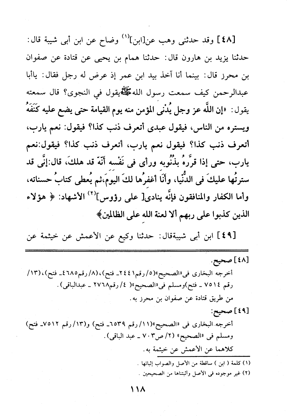 48 - وَقَدْ حَدَّثَنِي وَهْبٌ عَنْ اِبْنِ وَضَّاحٍ، عَنْ اِبْنِ أَبِي شَيْبَةَ قَالَ: حَدَّثَنَا يَزِيدُ بْنُ هَارُونَ قَالَ: حَدَّثَنَا هَمَّامُ بْنُ يَحْيَى عَنْ قَتَادَةَ، عَنْ صَفْوَانَ بْنِ مُحْرِزٍ قَالَ: بَيْنَمَا أَنَا آخِذٌ بِيَدِ اِبْنِ عُمَرَ إِذْ عَرَضَ لَهُ رَجُلٌ فَقَالَ: يَا أَبَا عَبْدِ الرَّحْمَنِ كَيْفَ سَمِعْتَ رَسُولَ اَللَّهِ صَلَّى اَللَّهُ عَلَيْهِ وَسَلَّمَ فِي اَلنَّجْوَى? قَالَ سَمِعْتُه يَقُولُ: إِنَّ اَللَّهَ عَزَّ وَجَلَّ يُدْنِي اَلْمُؤْمِنَ مِنْهُ يَوْمَ اَلْقِيَامَةِ حَتَّى يَضَعَ عَلَيْهِ كَنَفَهُ وَيَسْتُرُهُ مِنْ اَلنَّاسِ، فَيَقُولُ عَبْدِي أَتَعْرِفُ ذَنْبَ كَذَا? فَيَقُولُ: نَعَمْ يَا رَبِّ، أَتَعْرِفُ ذَنْبَ كَذَا? فَيَقُولُ: نَعَمْ يَا رَبِّ، أَتَعْرِفُ ذَنْبَ كَذَا? فَيَقُولُ: نَعَمْ يَا رَبِّ، حَتَّى إِذَا قَرَّرَهُ بِذُنُوبِهِ وَرَأَى فِي نَفْسِهِ أَنَّهُ قَدْ هَلَكَ، قَالَ: إِنِّي قَدْ سَتَرْتُهَا عَلَيْكَ فِي اَلدُّنْيَا، وَأَنَا أَغْفِرُهَا لَكَ اَلْيَوْمَ، ثُمَّ يُعْطَى كِتَابَ حَسَنَاتِهِ، وَأَمَّا اَلْكُفَّارُ وَالْمُنَافِقُونَ فَإِنَّهُ يُنَادَى عَلَى رُؤُوسِ اَلْأَشْهَادِ هَؤُلَاءِ اَلَّذِينَ كَذَبُوا عَلَى رَبِّهِمْ أَلَا لَعْنَةُ اَللَّهِ عَلَى اَلظَّالِمِينَ
