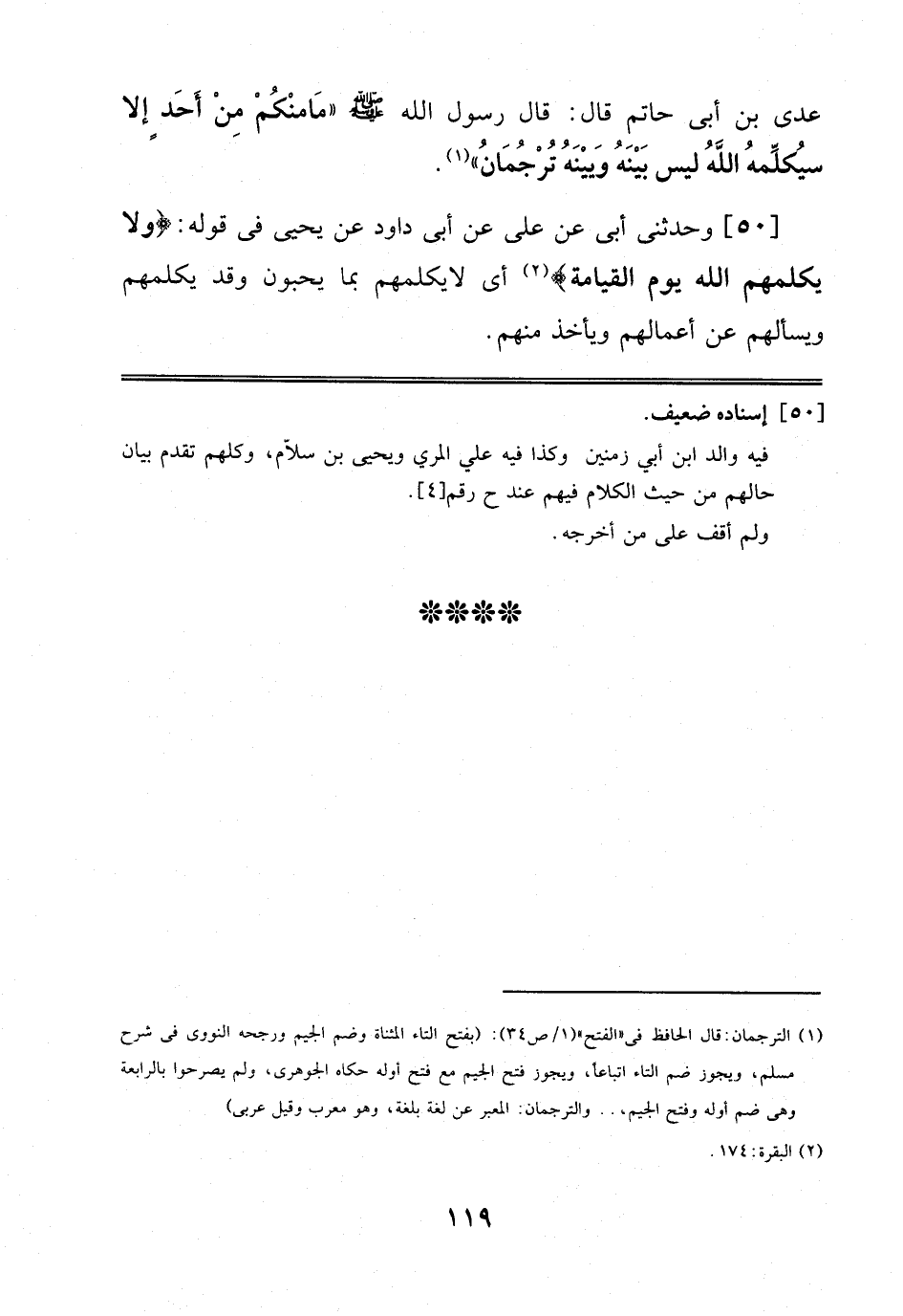 عَدِيِّ اِبْنِ َ حَاتِمٍ قَالَ: قَالَ رَسُولُ اَللَّهِ صَلَّى اَللَّهُ عَلَيْهِ وَسَلَّمَ: مَا مِنْكُمْ مِنْ أَحَدٍ إِلَّا سَيُكَلِّمُهُ اَللَّهُ لَيْسَ بَيْنَهُ وَبَيْنَهُ تُرْجُمَانٌ