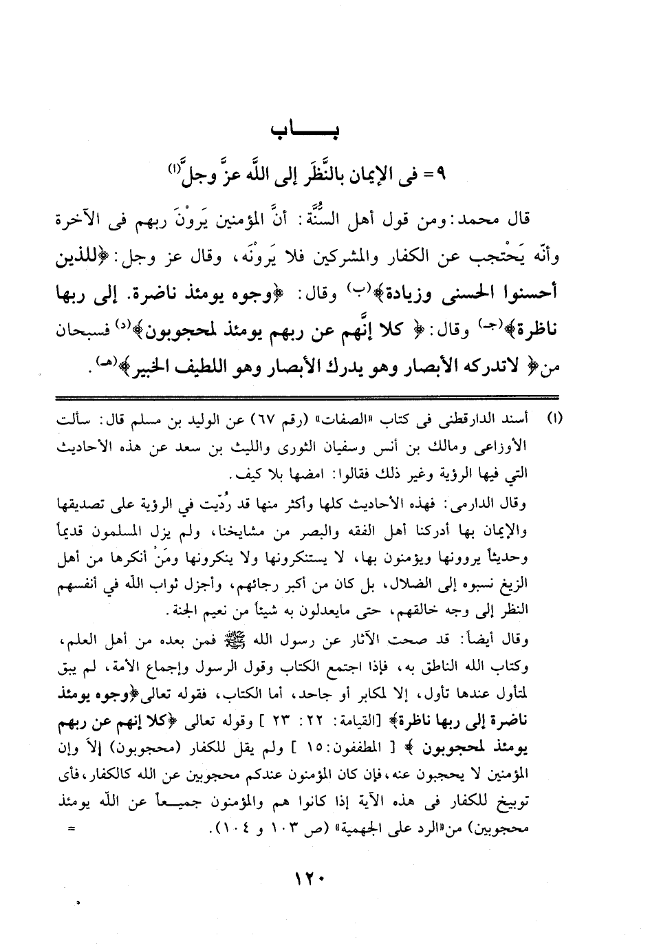 قَالَ مُحَمَّدٌ: وَمِنْ قَوْلِ أَهْلِ اَلسُّنَّةِ: إِنَّ اَلْمُؤْمِنِينَ يَرَوْنَ رَبَّهُمْ فِي اَلْآخِرَةِ وَأَنَّهُ يَحْتَجِبُ عَنْ اَلْكُفَّارِ وَالْمُشْرِكِينَ فَلَا يَرَوْنَهُ، وَقَالَ عَزَّ وَجَلَّ لِلَّذِينَ أَحْسَنُوا اَلْحُسْنَى وَزِيَادَةٌ وَقَالَ: وُجُوهٌ يَوْمَئِذٍ نَاضِرَةٌإِلَى رَبِّهَا نَاظِرَةٌ وَقَالَ: كَلَّا إِنَّهُمْ عَنْ رَبِّهِمْ يَوْمَئِذٍ لَمَحْجُوبُونَ فَسُبْحَانَ مَنْ لَا تُدْرِكُهُ اَلْأَبْصَارُ وَهُوَ يُدْرِكُ اَلْأَبْصَارَ وَهُوَ اَللَّطِيفُ اَلْخَبِيرُ