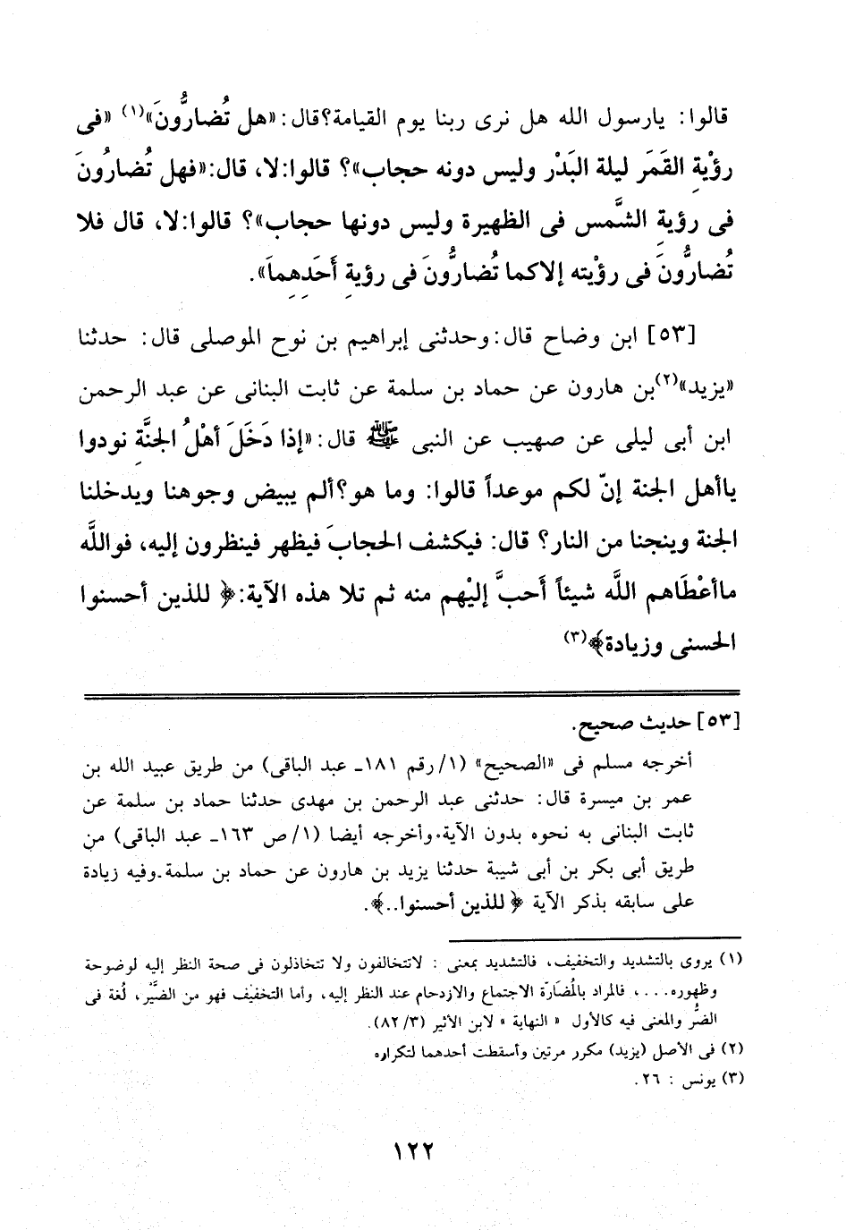 53 - اِبْنُ وَضَّاحٍ قَالَ: وَحَدَّثَنِي إِبْرَاهِيمُ بْنُ نُوحٍ اَلْمَوْصِلِيُّ قَالَ: حَدَّثَنَا يَزِيدُ بْنُ هَارُونَ عَنْ حَمَّادِ بْنِ سَلَمَةَ، عَنْ ثَابِتٍ الْبُنَانِيِّ، عَنْ عبد الرحمن بْنِ أَبِي لَيْلَى، عَنْ صُهَيْبٍ، عَنْ اَلنَّبِيِّ صَلَّى اَللَّهُ عَلَيْهِ وَسَلَّمَ قَالَ: إِذَا دَخَلَ أَهْلُ اَلْجَنَّةِ نُودُوا يَا أَهْلَ اَلْجَنَّةِ إِنَّ لَكُمْ مَوْعِدًا قَالُوا: وَمَا هُوَ? أَلَمْ يُبَيِّضْ وُجُوهَنَا وَيُدْخِلْنَا اَلْجَنَّةَ وَيُنْجِنَا مِنْ اَلنَّارِ? قَالَ: فَيُكْشَفُ اَلْحِجَابُ فَيَظْهَرُ فَيَنْظُرُونَ إِلَيْهِ، فَوَاَللَّهِ مَا أَعْطَاهُمْ اَللَّهُ شَيْئًا أَحَبَّ إِلَيْهِمْ مِنْهُ، ثُمَّ تَلَا هَذِهِ اَلْآيَةَ: لِلَّذِينَ أَحْسَنُوا اَلْحُسْنَى وَزِيَادَةٌ