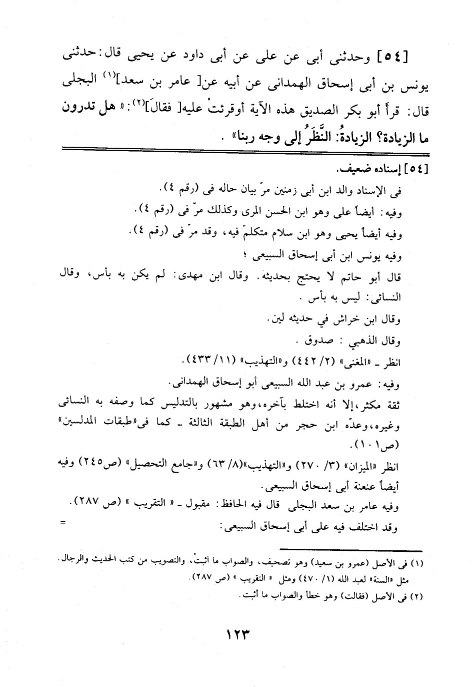 54 - وَحَدَّثَنِي أَبِي عَنْ عَلِيٍّ، عَنْ أَبِي دَاوُدَ، عَنْ يَحْيَى قَالَ: حَدَّثَنِي يُونُسُ بْنُ أَبِي إِسْحَاقَ اَلْهَمْدَانِيُّ عَنْ أَبِيهِ، عَنْ عَامِرِ بْنِ سَعْدٍ الْبَجَلِيِّ قَالَ: قَرَأَ أَبُو بَكْرٍ اَلصِّدِّيقُ هَذِهِ اَلْآيَةَ أَوْ قُرِئَتْ عَلَيْهِ فَقَالَ: "هَلْ تَدْرُونَ مَا اَلزِّيَادَةُ? اَلزِّيَادَةُ اَلنَّظَرُ إِلَى وَجْهِ رَبِّنَا".