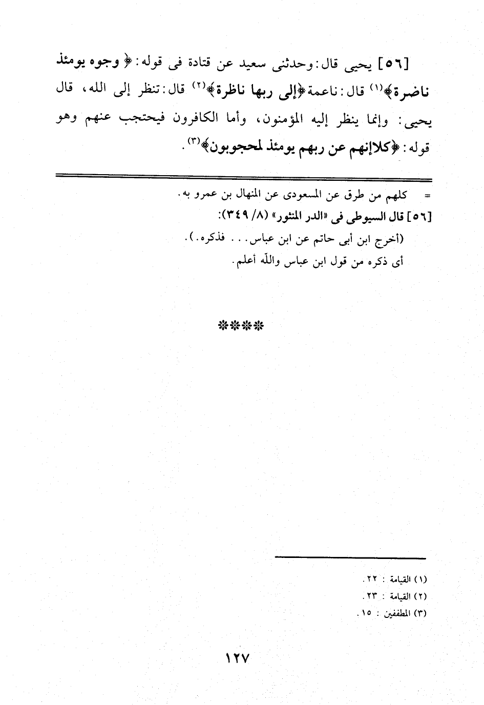 56 - يَحْيَى قَالَ: وَحَدَّثَنِي سَعِيدٌ عَنْ قَتَادَةَ فِي قَوْلِهِ: وُجُوهٌ يَوْمَئِذٍ نَاضِرَةٌقَالَ: نَاعِمَةٌ إِلَى رَبِّهَا نَاظِرَةٌقَالَ: تَنْظُرُ إِلَى اَللَّهِ، قَالَ يَحْيَى: وَإِنَّمَا يَنْظُرُ إِلَيْهِ اَلْمُؤْمِنُونَ، وَأَمَّا اَلْكَافِرُونَ فَيَحْتَجِبُ عَنْهُمْ وَهُوَ قَوْلُهُ: كَلَّا إِنَّهُمْ عَنْ رَبِّهِمْ يَوْمَئِذٍ لَمَحْجُوبُونَ