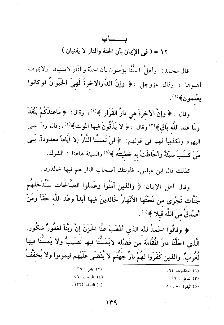 قَالَ مُحَمَّدٌ: وَأَهْلُ اَلسُّنَّةِ يُؤْمِنُونَ بِأَنَّ اَلْجَنَّةَ وَالنَّارَ لَا يَفْنَيَانِ وَلَا يَمُوتُ أَهْلُوهَا، وَقَالَ عَزَّ وَجَلَّ: وَإِنَّ اَلدَّارَ اَلْآخِرَةَ لَهِيَ اَلْحَيَوَانُ لَوْ كَانُوا يَعْلَمُونَ وَقَالَ: وَإِنَّ اَلْآخِرَةَ هِيَ دَارُ اَلْقَرَارِ وَقَالَ: مَا عِنْدَكُمْ يَنْفَدُ وَمَا عِنْدَ اَللَّهِ بَاقٍ وَقَالَ: لَا يَذُوقُونَ فِيهَا اَلْمَوْتَ وَقَالَ رَدًّا عَلَى اَلْيَهُودِ وَتَكْذِيبًا لَهُمْ فِي قَوْلِهِمْ: وَقَالُوا لَنْ تَمَسَّنَا اَلنَّارُ إِلَّا أَيَّامًا مَعْدُودَةً قُلْ أَتَّخَذْتُمْ عِنْدَ اَللَّهِ عَهْدًا فَلَنْ يُخْلِفَ اَللَّهُ عَهْدَهُ أَمْ تَقُولُونَ عَلَى اَللَّهِ مَا لَا تَعْلَمُونَ بَلَى مَنْ كَسَبَ سَيِّئَةً وَأَحَاطَتْ بِهِ خَطِيئَتُهُ وَالسَّيِّئَةُ هَا هُنَا اَلشِّرْكُ، كَذَلِكَ قَالَ اِبْنُ عَبَّاسٍ، فَأُولَئِكَ أَصْحَابُ اَلنَّارِ هُمْ فِيهَا خَالِدُونَ.
