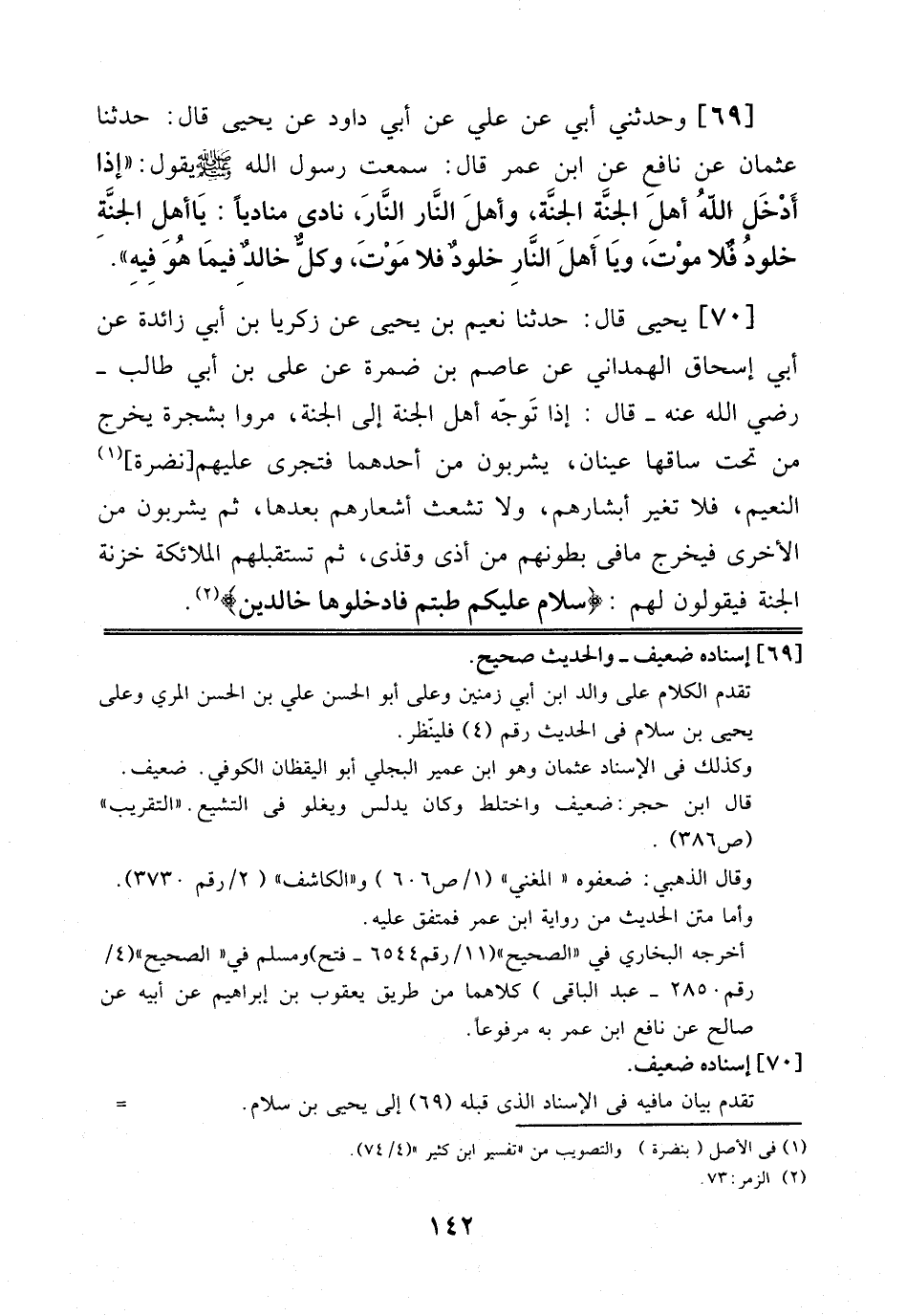 70 - يَحْيَى قَالَ: حَدَّثَنَا نُعَيْمُ بْنُ يَحْيَى عَنْ زَكَرِيَّا بْنِ أَبِي زَائِدَةَ عَنْ أَبِي إِسْحَاقَ اَلْهَمْدَانِيِّ عَنْ عَاصِمِ بْنِ ضَمْرَةَ، عَنْ عَلِيِّ بْنِ أَبِي طَالِبٍ رَضِيَ اَللَّهُ عَنْهُ قَالَ: إِذَا تَوَجَّهَ أَهْلُ اَلْجَنَّةِ إِلَى اَلْجَنَّةِ، مَرُّوا بِشَجَرَةٍ يَخْرُجُ مِنْ تَحْتِ سَاقِهَا عَيْنَانِ، يَشْرَبُونَ مِنْ أَحَدِهِمَا فَتَجْرِي عَلَيْهِمْ نَضْرَةُ اَلنَّعِيمِ، فَلَا تُغَيَّرُ أَبْشَارُهُمْ، وَلَا تَشْعَثُ أَشْعَارُهُمْ بَعْدَهَا، ثُمَّ يَشْرَبُونَ مِنْ اَلْأُخْرَى فَيَخْرُجُ مَا فِي بُطُونِهِمْ مِنْ أَذًى وَقَذًى، ثُمَّ تَسْتَقْبِلُهُمْ اَلْمَلَائِكَةُ خَزَنَةُ اَلْجَنَّةِ فَيَقُولُ لَهُمْ: سَلَامٌ عَلَيْكُمْ طِبْتُمْ فَادْخُلُوهَا خَالِدِينَ