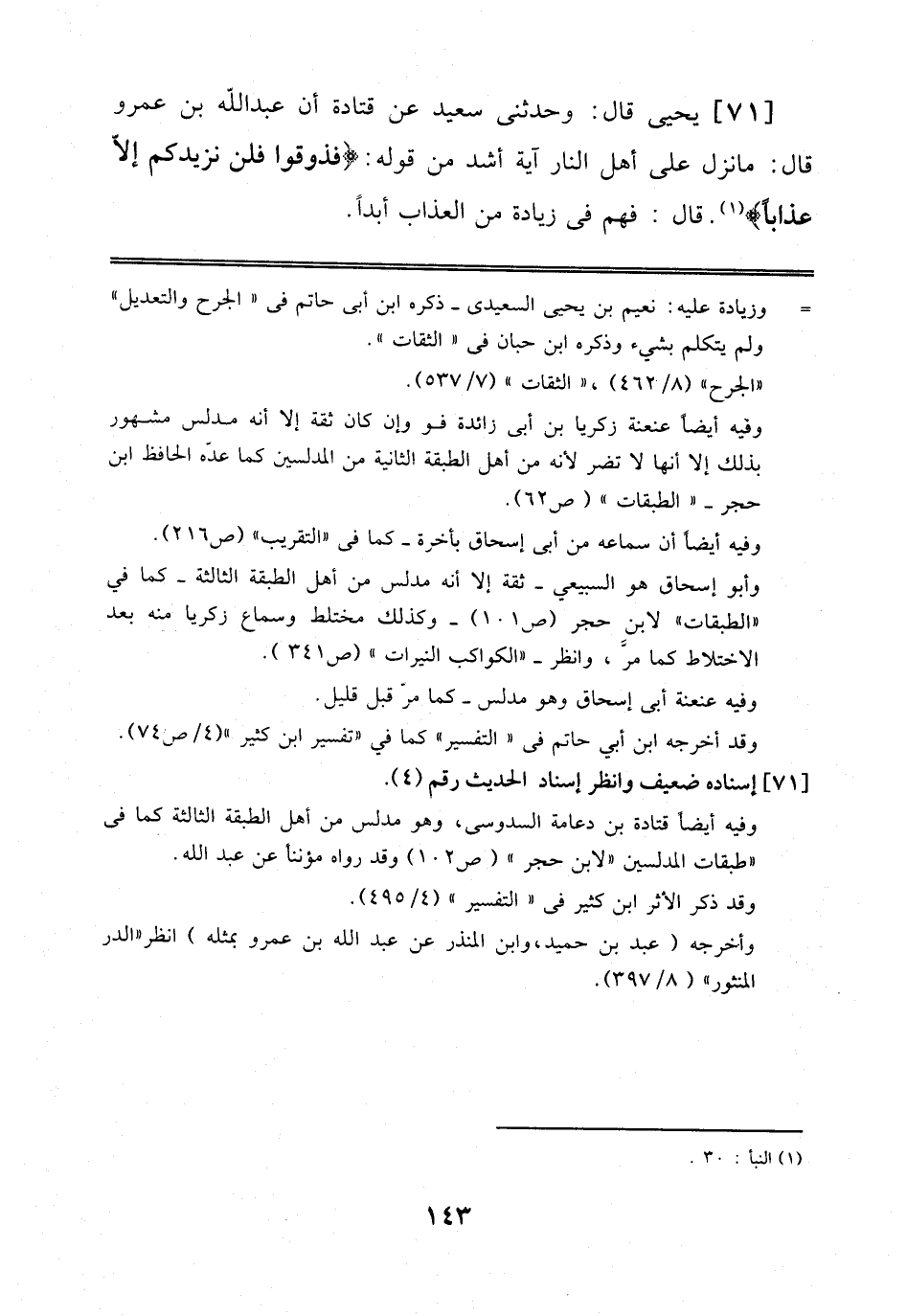71 - يَحْيَى قَالَ: وَحَدَّثَنِي سَعِيدٌ عَنْ قَتَادَةَ أَنَّ عَبْدَ اللهِ بْنَ عَمْرٍو قَالَ: مَا نَزَلَ عَلَى أَهْلِ اَلنَّارِ آيَةٌ أَشَدُّ مِنْ قَوْلِهِ: فَذُوقُوا فَلَنْ نَزِيدَكُمْ إِلَّا عَذَابًاقَالَ: فَهُمْ فِي زِيَادَةِ مِنْ اَلْعَذَابِ أَبَدًا.