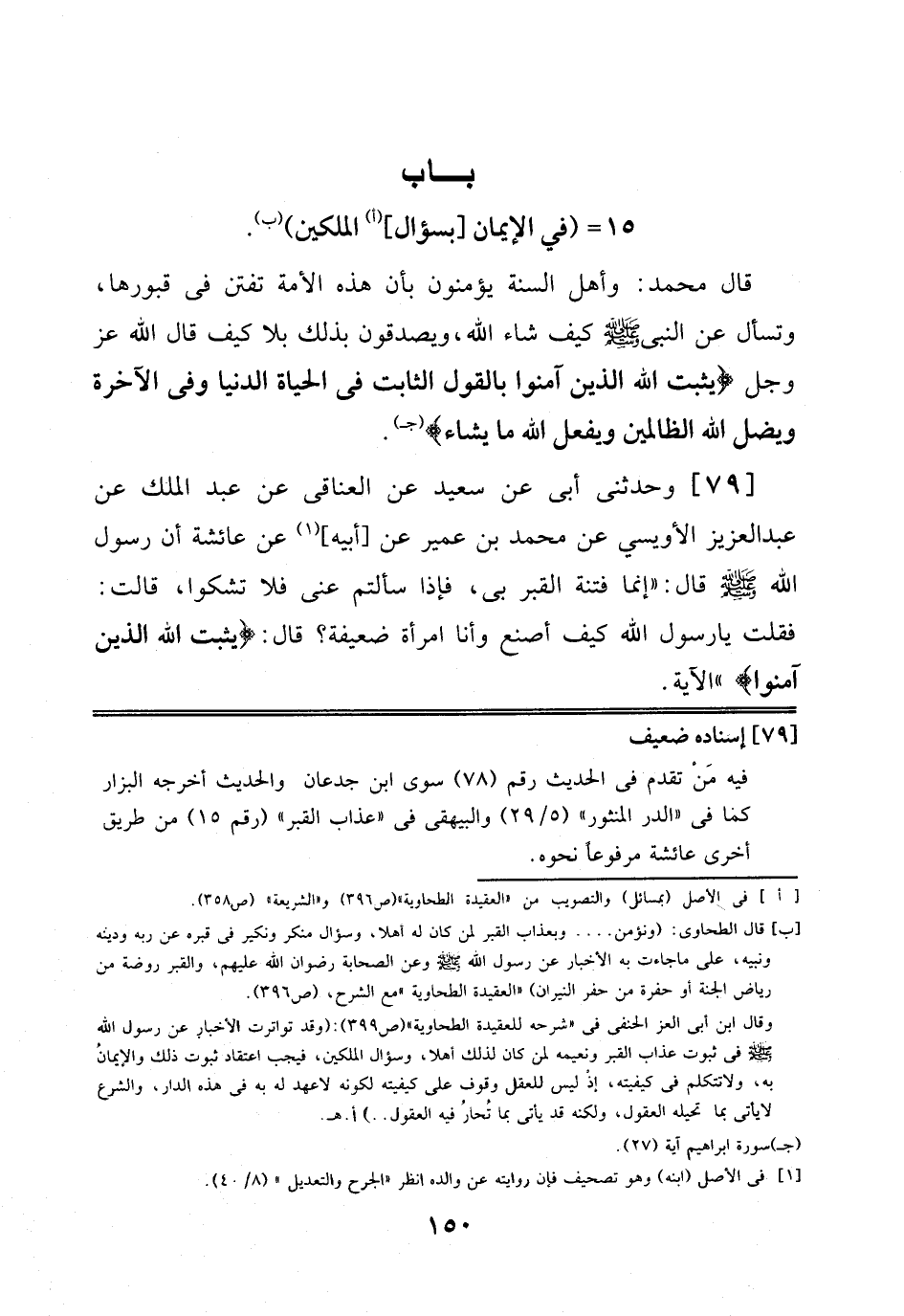 قَالَ مُحَمَّدٌ: وَأَهْلُ اَلسُّنَّةِ يُؤْمِنُونَ بِأَنَّ هَذِهِ اَلْأُمَّةَ تُفْتَنُ فِي قُبُورِهَا، وَتُسْأَلُ عَنْ اَلنَّبِيِّ صَلَّى اَللَّهُ عَلَيْهِ وَسَلَّمَ كَيْفٍ شَاءَ اَللَّهُ، وَيُصَدِّقُونَ بِذَلِكَ بِلَا كَيْفٍ قَالَ اَللَّهُ عَزَّ وَجَلَّ: يُثَبِّتُ اَللَّهُ اَلَّذِينَ آمَنُوا بِالْقَوْلِ اَلثَّابِتِ فِي اَلْحَيَاةِ اَلدُّنْيَا وَفِي اَلْآخِرَةِ وَيُضِلُّ اَللَّهُ اَلظَّالِمِينَ وَيَفْعَلُ اَللَّهُ مَا يَشَاءُ