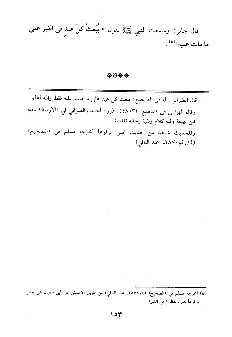 قَالَ جَابِرٌ: وَسَمِعْتُ اَلنَّبِيَّ صَلَّى اَللَّهُ عَلَيْهِ وَسَلَّمَ يَقُولُ: يُبْعَثُ كُلَّ عَبْدٍ فِي اَلْقَبْرِ عَلَى مَا مَاتَ عَلَيْهِ
