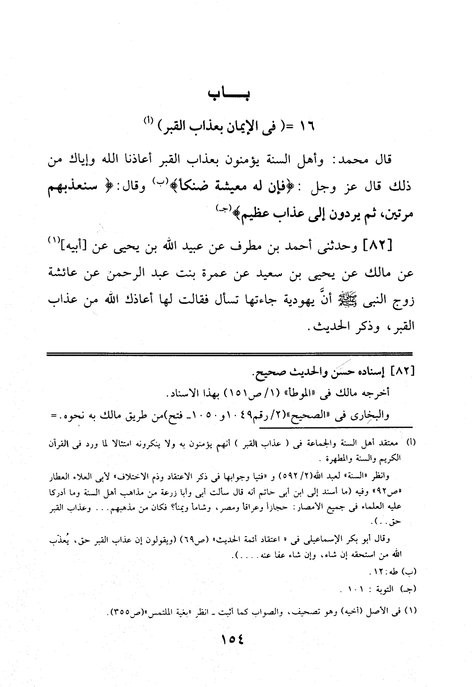 قَالَ مُحَمَّدٌ: وَأَهْلُ اَلسُّنَّةِ يُؤْمِنُونَ بِعَذَابِ اَلْقَبْرِ أَعَاذَنَا اَللَّهُ وَإِيَّاكَ مِنْ ذَلِكَ قَالَ عَزَّ وَجَلَّ: فَإِنَّ لَهُ مَعِيشَةً ضَنْكًا وَقَالَ: سَنُعَذِّبُهُمْ مَرَّتَيْنِ ثُمَّ يُرَدُّونَ إِلَى عَذَابٍ عَظِيمٍ