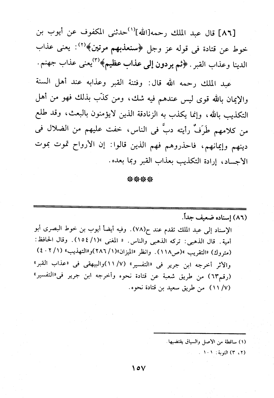 86 - قَالَ عَبْد الْمَلِكِ رَحِمَهُ اَللَّهُ حَدَّثَنِي اَلْمَكْفُوفُ عَنْ أَيُّوبَ بْنِ خُوطٍ عَنْ قَتَادَةَ فِي قَوْلِهِ عَزَّ وَجَلَّ: سَنُعَذِّبُهُمْ مَرَّتَيْنِيَعْنِي عَذَابَ اَلدُّنْيَا وَعَذَابَ اَلْقَبْرِ ثُمَّ يُرَدُّونَ إِلَى عَذَابٍ عَظِيمٍيَعْنِي عَذَابَ جَهَنَّمَ.