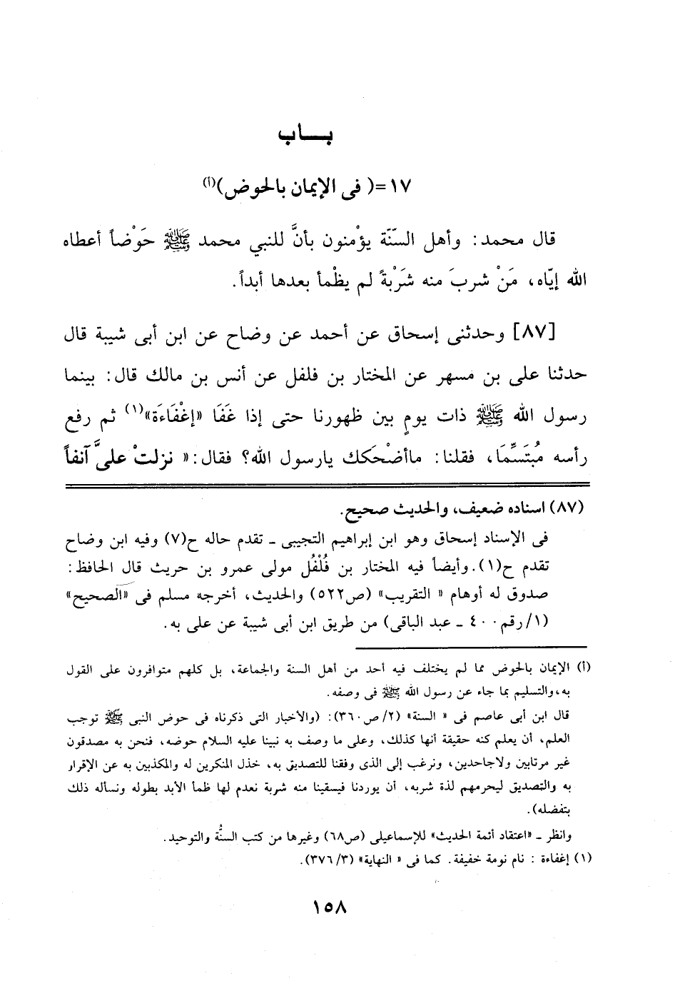 87 - وَحَدَّثَنِي إِسْحَاقُ عَنْ أَحْمَدَ، عَنْ وَضَّاحٍ، عَنْ اِبْنِ أَبِي شَيْبَةَ قَالَ: حَدَّثَنَا عَلِيُّ بْنُ مُسْهِرٍ عَنْ اَلْمُخْتَارِ بْنِ فُلْفُلٍ، عَنْ أَنَسِ بْنِ مَالِكٍ قَالَ: بَيْنَمَا رَسُولُ اَللَّهِ صَلَّى اَللَّهُ عَلَيْهِ وَسَلَّمَ ذَاتَ يَوْمٍ بَيْنَ ظُهُورِنَا حَتَّى إِذَا غَفَا إِغْفَاءَةً ثُمَّ رَفَعَ رَأْسَهُ مُبْتَسِمًا، فَقُلْنَا مَا أَضْحَكَكَ يَا رَسُولَ اَللَّهِ? فَقَالَ: نَزَلَتْ عَلَيَّ آنِفًا