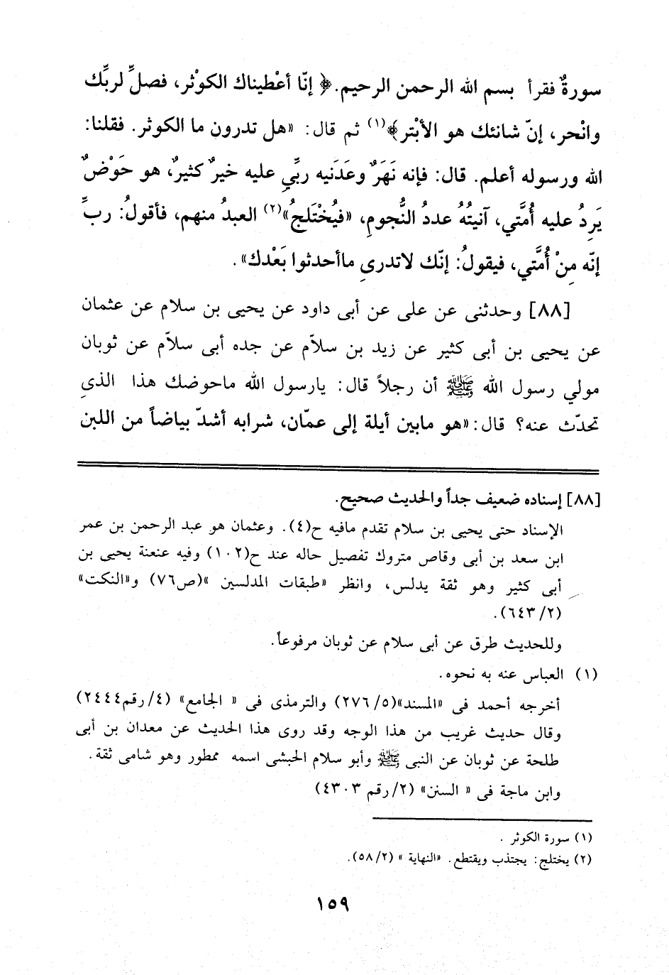 سُورَةً فَقَرَأَ بِسْمِ اَللَّهِ اَلرَّحْمَنِ اَلرَّحِيمِ: إِنَّا أَعْطَيْنَاكَ اَلْكَوْثَرَ فَصَلِّ لِرَبِّكَ وَانْحَرْ إِنَّ شَانِئَكَ هُوَ اَلْأَبْتَرُثُمَّ قَالَ: هَلْ تَدْرُونَ مَا اَلْكَوْثَرُ? فَقُلْنَا اَللَّهُ وَرَسُولُهُ أَعْلَمُ. قَالَ: فَإِنَّهُ نَهْرٌ وَعَدَنِيهِ رَبِّي عَلَيْهِ خَيْرٌ كَثِيرٌ، هُوَ حَوْضٌ يَرِدُ عَلَيْهِ أُمَّتِي، آنِيَتُهُ عَدَدُ اَلنُّجُومِ فَيُخْتَلَجُ اَلْعَبْدُ مِنْهُمْ، فَأَقُولُ: رَبِّ إِنَّهُ مِنْ أُمَّتِي، فَيَقُولُ: إِنَّكَ لَا تَدْرِي مَا أَحْدَثُوا بَعْدَكَ