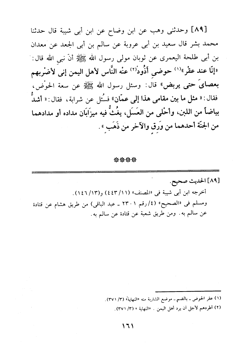 89 - وَحَدَّثَنِي وَهْبٌ عَنْ اِبْنِ وَضَّاحٍ عَنْ اِبْنِ أَبِي شَيْبَةَ قَالَ: حَدَّثَنَا مُحَمَّدُ بْنُ بِشْرٍ قَالَ: سَعِيدُ بْنُ أَبِي عَرُوبَةَ عَنْ سَالِمِ بْنِ أَبِي اَلْجَعْدِ عَنْ مَعْدَانَ بْنِ أَبِي طَلْحَةَ الْيَعْمُرِيِّ عَنْ ثَوْبَانَ مَوْلَى رَسُولِ اَللَّهِ صَلَّى اَللَّهُ عَلَيْهِ وَسَلَّمَ أَنَّ نَبِيَّ اَللَّهِ قَالَ: أَنَا عِنْدَ عُقْرِ حَوْضِي أَذُودُ عَنْهُ اَلنَّاسَ لِأَهْلِ اَلْيَمَنِ إِنِّي لَأَضْرِبُهُمْ بِعَصَايَ حَتَّى يَرْفَضَّ قَالَ: وَسُئِلَ رَسُولُ اَللَّهِ صَلَّى اَللَّهُ عَلَيْهِ وَسَلَّمَ عَنْ سَعَةِ اَلْحَوْضِ? فَقَالَ: مِثْلُ مَا بَيْنَ مَقَامِي هَذَا إِلَى عُمَانَ فَسُئِلَ عَنْ شَرَابِهِ? فَقَالَ: أَشَدُّ بَيَاضًا مِنْ اَللَّبَنِ، وَأَحْلَى مِنْ اَلْعَسَلِ، يَغُتُّ فِيهِ مِيزَابَانِ مِدَادُهُ أَوْ مِدَادُهُمَا مِنْ اَلْجَنَّةِ أَحَدُهُمَا مِنْ وَرِقٍ وَالْآخَرُ مِنْ ذَهَبٍ