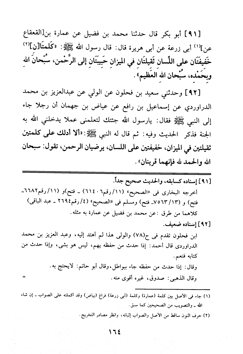 91 - أَبُو بَكْرٍ قَالَ: حَدَّثَنَا مُحَمَّدُ بْنُ فُضَيْلٍ عَنْ عِمَارَةَ بْنِ اَلْقَعْقَاعِ عَنْ أَبِي زُرْعَةَ عَنْ أَبِي هُرَيْرَةَ قَالَ: قَالَ رَسُولُ اَللَّهِ صَلَّى اَللَّهُ عَلَيْهِ وَسَلَّمَ: كَلِمَتَانِ خَفِيفَتَانِ عَلَى اَللِّسَانِ، ثَقِيلَتَانِ فِي اَلْمِيزَانِ، حَبِيبَتَانِ إِلَى اَلرَّحْمَنِ، سُبْحَانَ اَللَّه وَبِحَمْدِهِ، سُبْحَانَ اَللَّه اَلْعَظِيمِ