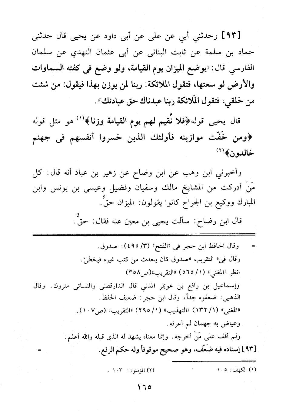 93 - وَحَدَّثَنِي أَبِي عَنْ عَلِيٍّ، عَنْ أَبِي دَاوُدَ، عَنْ يَحْيَى قَالَ: حَدَّثَنِي حَمَّادُ بْنُ سَلَمَةَ عَنْ ثَابِتٍ الْبُنَانِيِّ عَنْ أَبِي عُثْمَانَ النَّهْدِيِّ، عَنْ سَلْمَانَ اَلْفَارِسِيِّ قَالَ: يُوضَعُ اَلْمِيزَانُ يَوْمَ اَلْقِيَامَةِ، وَلَوْ وُضِعَ فِي كِفَّتِهِ اَلسَّمَاوَاتُ وَالْأَرْضُ لَوَسِعَتْهَا، فَتَقُولُ اَلْمَلَائِكَةُ: رَبَّنَا لِمَنْ يُوزَنُ بِهَذَا فَيَقُولُ: مَنْ شِئْتُ مِنْ خَلْقِي، فَتَقُولُ اَلْمَلَائِكَةُ رَبَّنَا عَبَدْنَاك حَقَّ عِبَادَتِكَ
