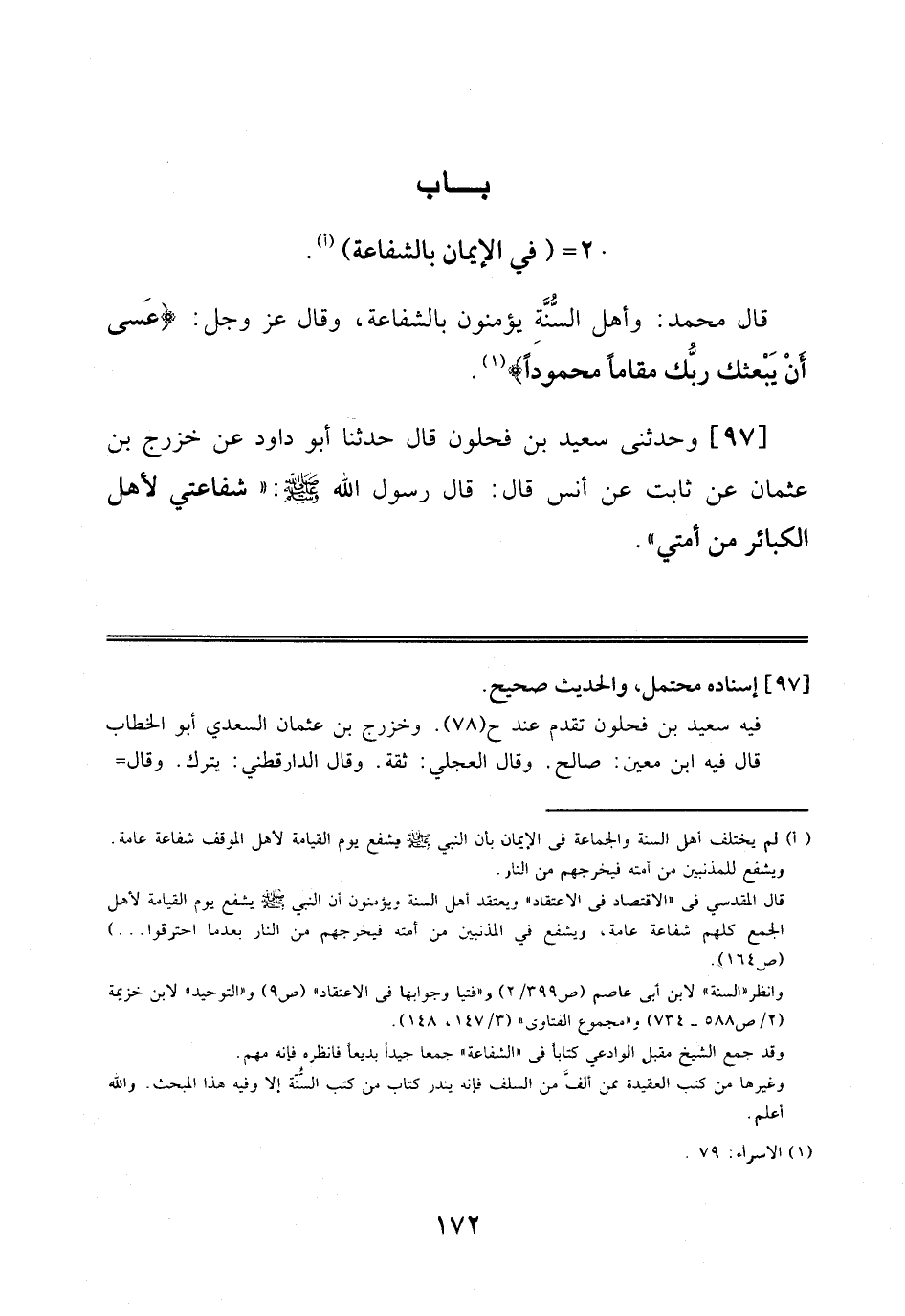 97 - وَحَدَّثَنِي سَعِيدُ بْنُ فَحْلُونَ قَالَ: حَدَّثَنَا أَبُو دَاوُدَ، عَنْ خَزْرَجِ بْنِ عُثْمَانَ، عَنْ ثَابِتٍ، عَنْ أَنَسٍ قَالَ: قَالَ رَسُولُ اَللَّهِ صَلَّى اَللَّهُ عَلَيْهِ وَسَلَّمَ: شَفَاعَتِي لِأَهْلِ اَلْكَبَائِرِ مِنْ أُمَّتِي