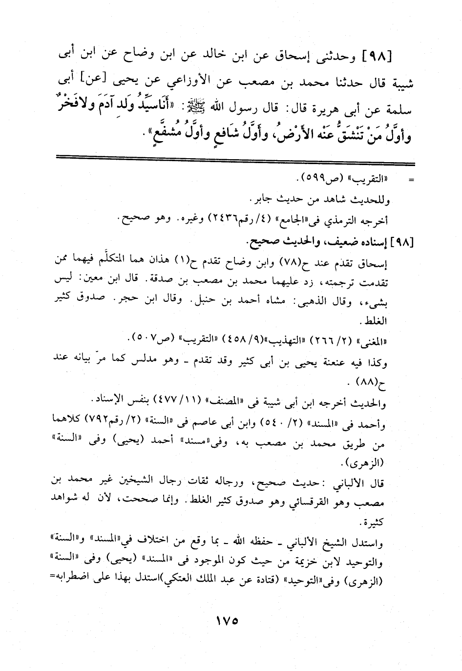 98 - وَحَدَّثَنِي إِسْحَاقُ عَنْ اِبْنِ خَالِدٍ، عَنْ اِبْنِ وَضَّاحٍ، عَنْ اِبْنِ أَبِي شَيْبَةَ قَالَ: حَدَّثَنَا مُحَمَّدُ بْنُ مُصْعَبٍ، عَنْ اَلْأَوْزَاعِيِّ، عَنْ يَحْيَى، عَنْ أَبِي سَلَمَةَ، عَنْ أَبِي هُرَيْرَةَ قَالَ: قَالَ رَسُولُ اَللَّهِ صَلَّى اَللَّهُ عَلَيْهِ وَسَلَّمَ: أَنَا سَيِّدُ وَلَدِ آدَمَ وَلَا فَخْرَ، وَأَوَّلُ مَنْ تَنْشَقُّ عَنْهُ اَلْأَرْضُ، وَأَوَّلُ شَافِعٍ، وَأَوَّلُ مُشَفَّعٍ