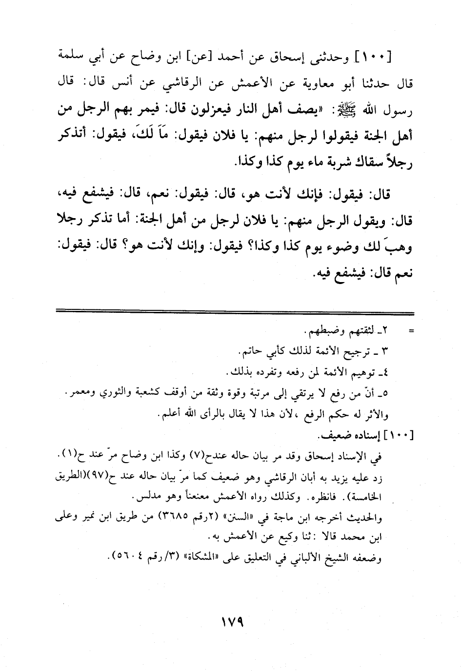 100 - وَحَدَّثَنِي إِسْحَاقُ عَنْ أَحْمَدَ، عَنْ اِبْنِ وَضَّاحٍ، عَنْ أَبِي سَلَمَةَ قَالَ: حَدَّثَنَا أَبُو مُعَاوِيَةَ، عَنْ اَلْأَعْمَشِ، عَنْ الرَّقَاشِيِّ، عَنْ أَنَسٍ قَالَ: قَالَ رَسُولُ اَللَّهِ صَلَّى اَللَّهُ عَلَيْهِ وَسَلَّمَ: يَصِفُ أَهْلَ اَلنَّارِ فَيُعْزَلُونَ قَالَ: فَيَمُرُّ بِهِمْ اَلرَّجُلُ مِنْ أَهْلِ اَلْجَنَّةِ فَيَقُولُوا لِرَجُلٍ مِنْهُمْ: يَا فُلَانُ فَيَقُولُ: مَا لَكَ، فَيَقُولُ: أَتَذْكُرُ رَجُلًا سَقَاك شَرْبَةَ مَاءٍ يَوْمَ كَذَا وَكَذَا قَالَ: فَيَقُولُ: فَإِنَّكَ لَأَنْتَ هُوَ، قَالَ: فَيَقُولُ: نَعَمْ، قَالَ: فَيَشْفَعُ فِيهِ، قَالَ: وَيَقُولُ اَلرَّجُلُ مِنْهُمْ: يَا فُلَانُ لِرَجُلٍ مِنْ أَهْلِ اَلْجَنَّةِ: أَمَا تَذْكُرُ رَجُلًا وَهَبَ لَكَ وَضُوءًا يَوْمَ كَذَا وَكَذَا? فَيَقُولُ: وَإِنَّكَ لَأَنْتَ هُوَ? قَالَ: فَيَقُولُ: نَعَمْ، قَالَ: فَيَشْفَعُ فِيهِ
