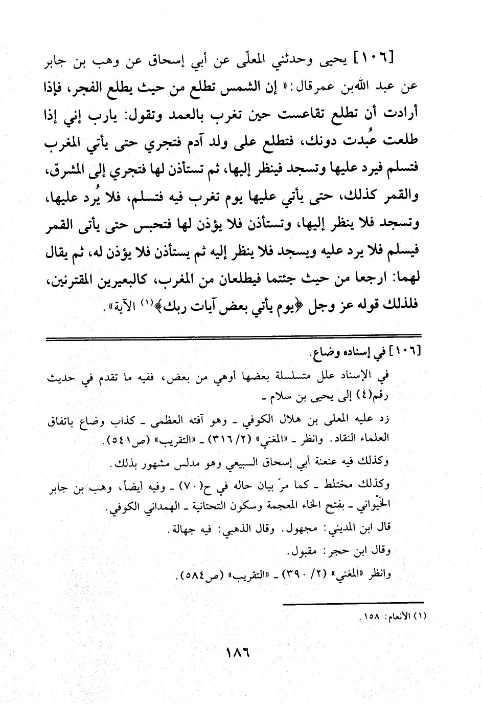 106 - يَحْيَى وَحَدَّثَنِي اَلْمُعَلَّى عَنْ أَبِي إِسْحَاقَ عَنْ وَهْبِ بْنِ جَابِرٍ، عَنْ عَبْدِ اللهِ اِبْنُ عُمَرَ قَالَ: "إِنَّ اَلشَّمْسَ تَطْلُعُ مِنْ حَيْثُ يَطْلُعُ اَلْفَجْرُ، فَإِذَا أَرَادَتْ أَنْ تَطْلُعَ تَقَاعَسَتْ حِينَ تَغْرُبُ بِالْعَمْدِ وَتَقُولُ: يَا رَبِّ إِنِّي إِذَا طَلَعْتُ عُبِدْتُ دُونَكَ: فَتَطْلُعُ عَلَى وَلَدِ آدَمَ فَتَجْرِي حَتَّى يَأْتِيَ اَلْمَغْرِبُ فَتُسَلِّمُ فَيَرُدُّ عَلَيْهَا وَتَسْجُدُ فَيَنْظُرُ إِلَيْهَا، ثُمَّ تَسْتَأْذِنُ لَهَا فَتَجْرِي إِلَى اَلْمَشْرِقِ، وَالْقَمَرُ كَذَلِكَ، حَتَّى يَأْتِيَ عَلَيْهَا يَوْمٌ تَغْرُبُ فِيهِ فَتُسَلِّمُ، فَلَا يُرَدُّ عَلَيْهَا، وَتَسْجُدُ فَلَا يُنْظَرُ إِلَيْهَا، وَتَسْتَأْذِنُ فَلَا يُؤْذَنُ لَهَا فَتُحْبَسُ حَتَّى يَأْتِيَ اَلْقَمَرُ فَيُسَلِّمُ فَلَا يُرَدُّ عَلَيْهِ وَيَسْجُدُ فَلَا يُنْظَرُ إِلَيْهِ ثُمَّ يَسْتَأْذِنُ فَلَا يُؤْذَنُ لَهُ، ثُمَّ يُقَالُ لَهُمَا: اِرْجِعَا مِنْ حَيْثُ جِئْتُمَا فَيَطْلُعَانِ مِنْ اَلْمَغْرِبِ كَالْبَعِيرَيْنِ اَلْمُقْتَرِنَيْنِ، فَذَلِكَ قَوْلُهُ عَزَّ وَجَلَّ: يَوْمَ يَأْتِي بَعْضُ آيَاتِ رَبِّكَاَلْآيَةَ".
