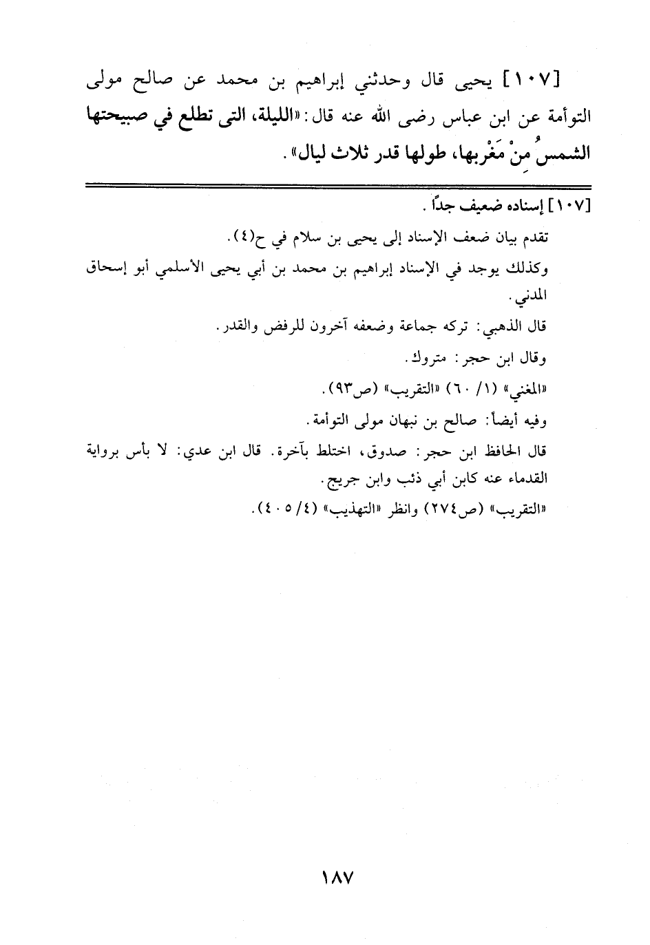 107 - يَحْيَى قَالَ: وَحَدَّثَنِي إِبْرَاهِيمُ بْنُ مُحَمَّدٍ، عَنْ صَالِحٍ مَوْلَى اَلتَّوْأَمَةِ عَنْ اِبْنِ عَبَّاسٍ رَضِيَ اَللَّهُ عَنْهُ قَالَ: "اَللَّيْلَةُ اَلَّتِي تَطْلُعُ فِي صَبِيحَتَهَا اَلشَّمْسُ مِنْ مَغْرِبِهَا، طُولُهَا قَدْرُ ثَلَاثِ لَيَالٍ".