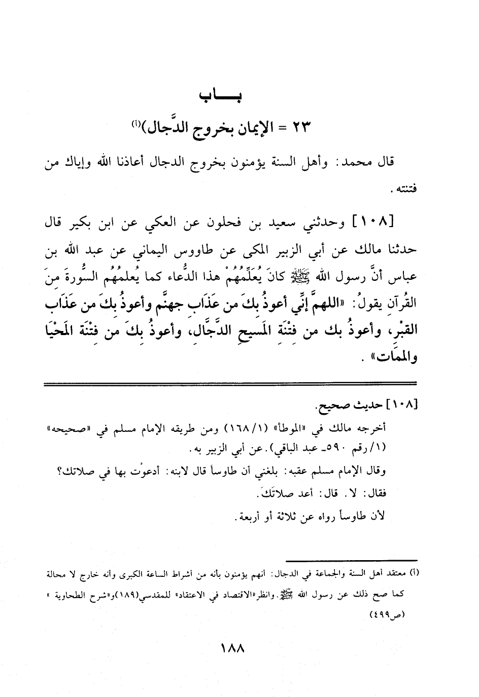 قَالَ مُحَمَّدٌ: وَأَهْلُ اَلسُّنَّةِ يُؤْمِنُونَ بِخُرُوجِ اَلدَّجَّالِ أَعَاذَنَا اَللَّهُ وَإِيَّاكَ مِنْ فِتْنَتِهِ.