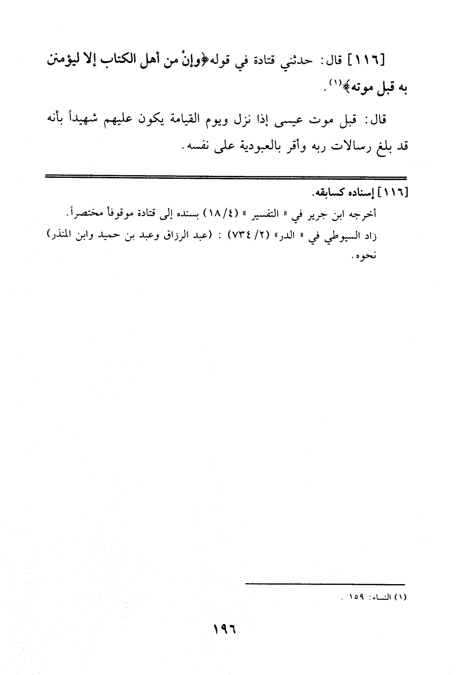 116 - قَالَ: حَدَّثَنِي قَتَادَةُ فِي قَوْلِهِ: وَإِن مِّنْ أَهْلِ اَلْكِتَابِ إِلَّا لَيُؤْمِنَنَّ بِهِ قَبْلَ مَوْتِهِ