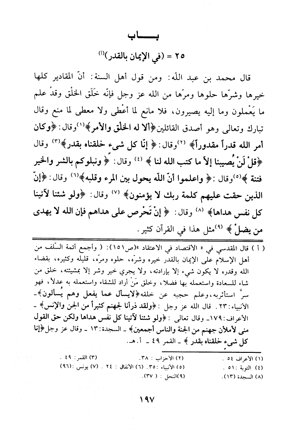 قَالَ مُحَمَّدُ بْنُ عَبْد اللَّه: وَمِنْ قَوْلِ أَهْلِ اَلسُّنَّةِ: أَنَّ اَلْمَقَادِيرَ كُلَّهَا خَيْرَهَا وَشَرَّهَا حُلْوَهَا وَمُرَّهَا مِنْ اَللَّهِ عَزَّ وَجَلَّ فَإِنَّهُ خَلَقَ اَلْخَلْقَ وَقَدْ عَلِمَ مَا يَعْمَلُونَ وَمَا إِلَيْهِ يَصِيرُونَ، فَلَا مَانِعَ لِمَا أَعْطَى، وَلَا مُعْطِيَ لِمَا مَنَعَ وَقَالَ تَبَارَكَ وَتَعَالَى وَهُوَ أَصْدَقُ اَلْقَائِلِينَ: أَلَا لَهُ اَلْخَلْقُ وَالْأَمْرُ وَقَالَ: وَكَانَ أَمْرُ اَللَّهِ قَدَرًا مَقْدُورًا وَقَالَ: إِنَّا كُلَّ شَيْءٍ خَلَقْنَاهُ بِقَدَرٍ وَقَالَ: قُلْ لَنْ يُصِيبَنَا إِلَّا مَا كَتَبَ اَللَّهُ لَنَا وَقَالَ: وَنَبْلُوكُمْ بِالشَّرِّ وَالْخَيْرِ فِتْنَةً وَقَالَ: وَاعْلَمُوا أَنَّ اَللَّهَ يَحُولُ بَيْنَ اَلْمَرْءِ وَقَلْبِهِ وَقَالَ: إِنَّ اَلَّذِينَ حَقَّتْ عَلَيْهِمْ كَلِمَةُ رَبِّكَ لَا يُؤْمِنُونَ وَقَالَ: وَلَوْ شِئْنَا لَآتَيْنَا كُلَّ نَفْسٍ هُدَاهَا وَقَالَ: إِنْ تَحْرِصْ عَلَى هُدَاهُمْ فَإِنَّ اَللَّهَ لَا يَهْدِي مَنْ يُضِلُّ مِثْلُ هَذَا فِي اَلْقُرْآنِ كَثِيرٌ.